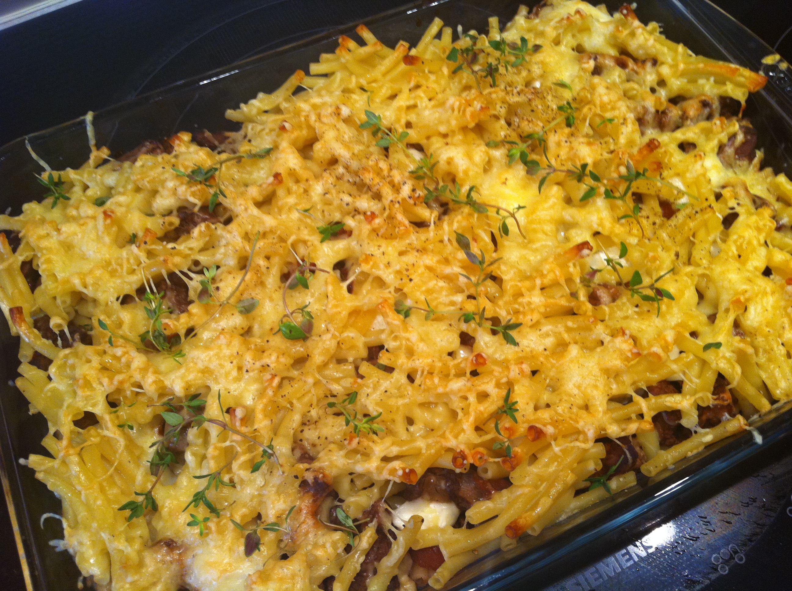 Put stew (including liquid, it will get soaked up by the pasta) between two rough layers of cooked macaroni. Plop some variation of chèvre evenly through the dish. Cover with a mix of grated cheese (Mrs J got a bag of pre-grated gratin mix cheeses, cause she was lazy didn’t have much time).