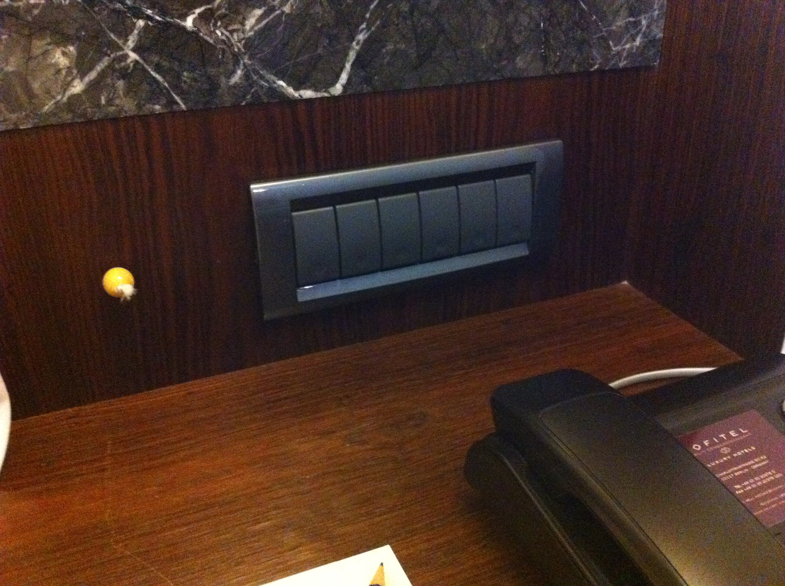 Control panel by the bed, probably designed by SPECTRE. The first button launches the coffee machine, the second launches the ICBM's. Ooops.