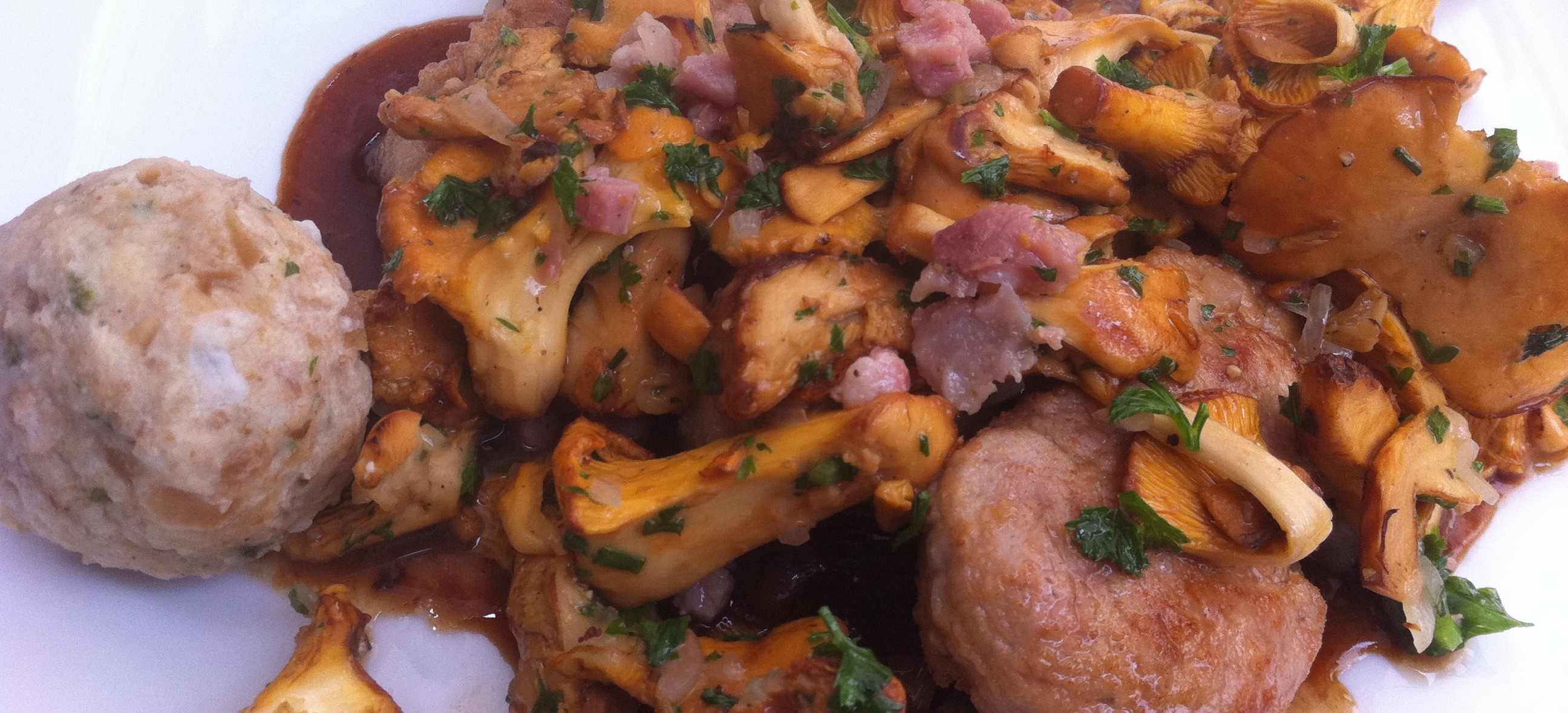 The Knödel (Semmelknödel) were served with chanterelles cooked lightly with some bacon, a choice of meat (Mrs J chose pork filet medallions) and a sweet red berry sauce.