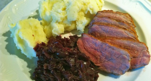 Cut the well rested (ahem…) duck breast and serve with the garlic mash and red cabbage. Sauce on the side.