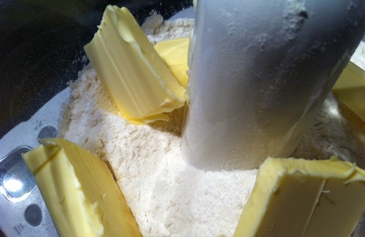 Dough in process(or), 125 grams of butter to 3 dl of flour. A couple of dashes of water. 20 seconds blitzing.