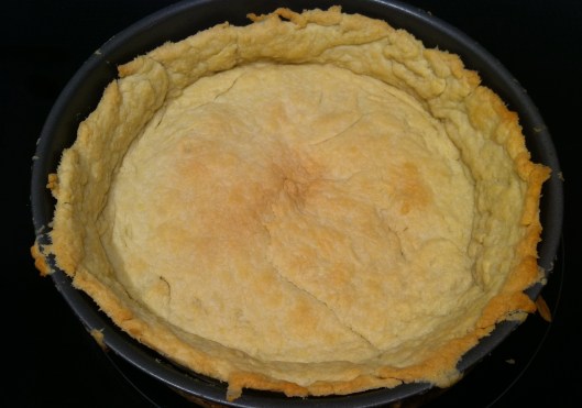 Roll out and/or press into pie dish. Cool for 30 min in Mr Fridge. Precook at 200°C for 10 min. It slides down the sides of the dish slightly and bubbles in the middle a bit. If you’re up for fancy-dancy cooking you can use some aluminum foil and some dry rice or peas to hold it on the sides and down in the middle.