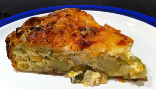 Put your preferred mix of leek, potatoes and fish in the pie shell. Sprinkle in some sweetcorn. Try to make the fish and the sweetcorn sit somewhat evenly in the middle of the pie. Mix four eggs with 1 dl of thick cream, 1 dl of semi skimmed milk and 2 generous tablespoons of cottage cheese. Add a generous tablespoon of salt and as much black pepper as you think is reasonable plus a bit more. Pour over the mix in the pie shell.