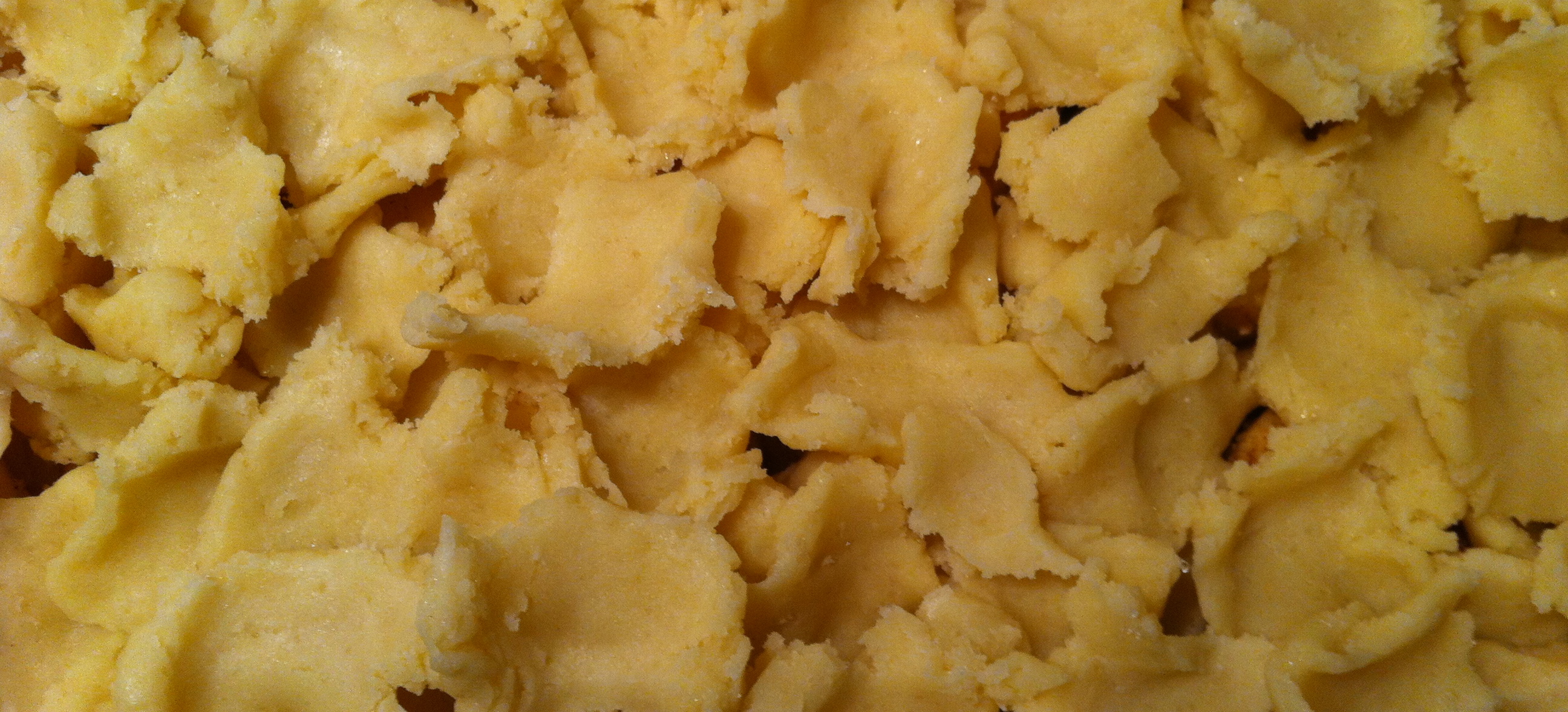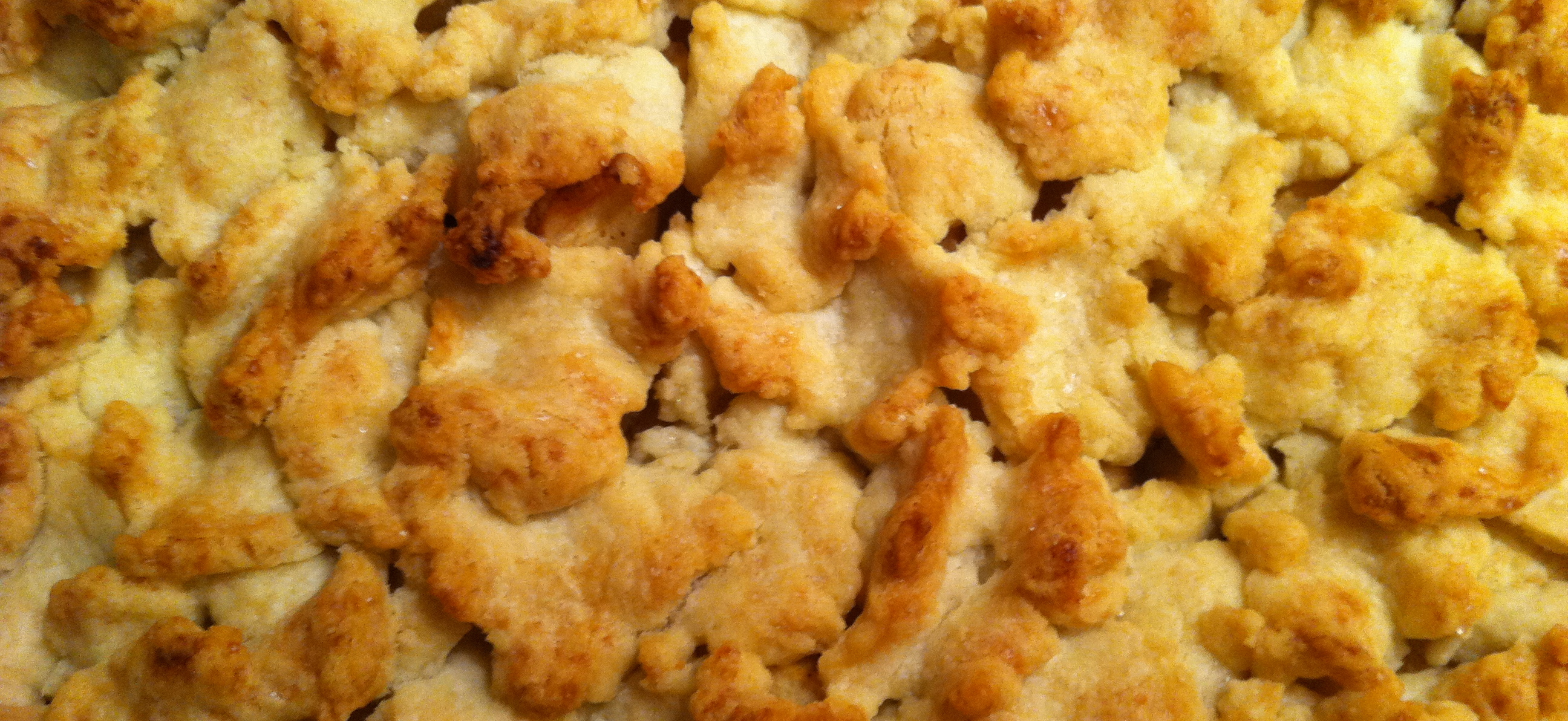 Make a dough mixing flour, butter, a bit of sugar and a pinch of salt. Add water by the teaspoon until it bunches up in the machine. Pinch the dough making corn-flake like bits of dough and distribute over the apples.