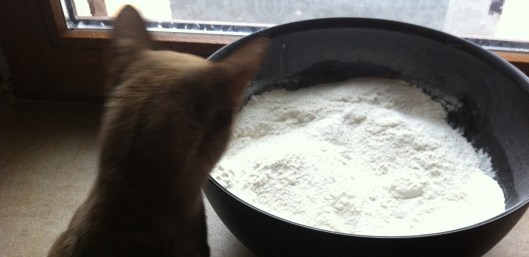 Combine 2.5 dl of flour with 1 tsp of baking soda and 2 dl of sugar in a large bowl. Make sure to keep any cats out of bowl.