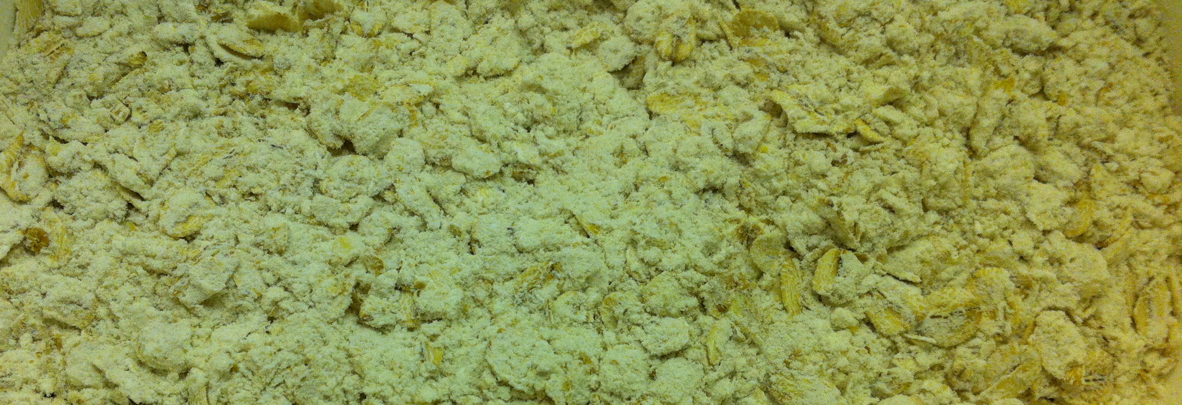Throw 3/4 of the oats crumble mix into a baking pan on top of a baking sheet and push it down so it sticks together a bit and forms a base.