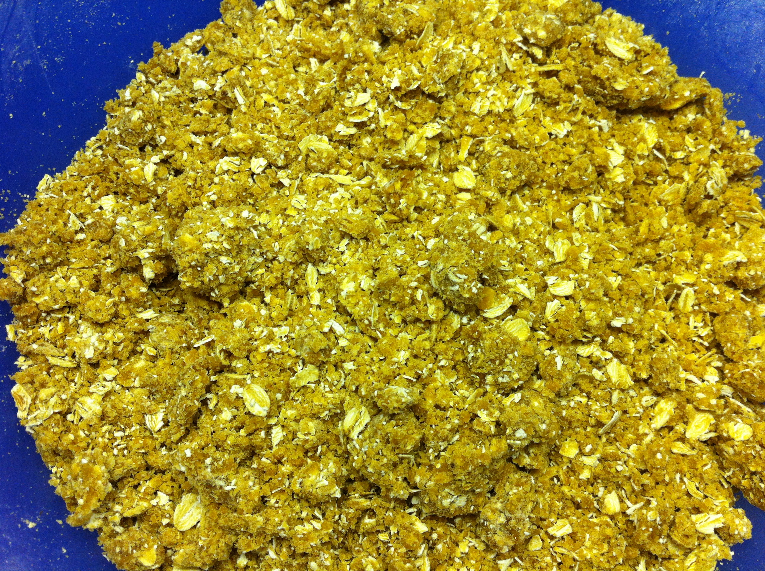 In a big bowl then mix 2 and 1/4 dl brown sugar, 2 tsp vanilla sugar and 50g melted butter. Add a whole large egg. Mix well. Then add your flour and oats mix. Mrs J would recommend to use hands directly in the mix (well cleaned, of course). You should get a nice crumbly mass at the end.