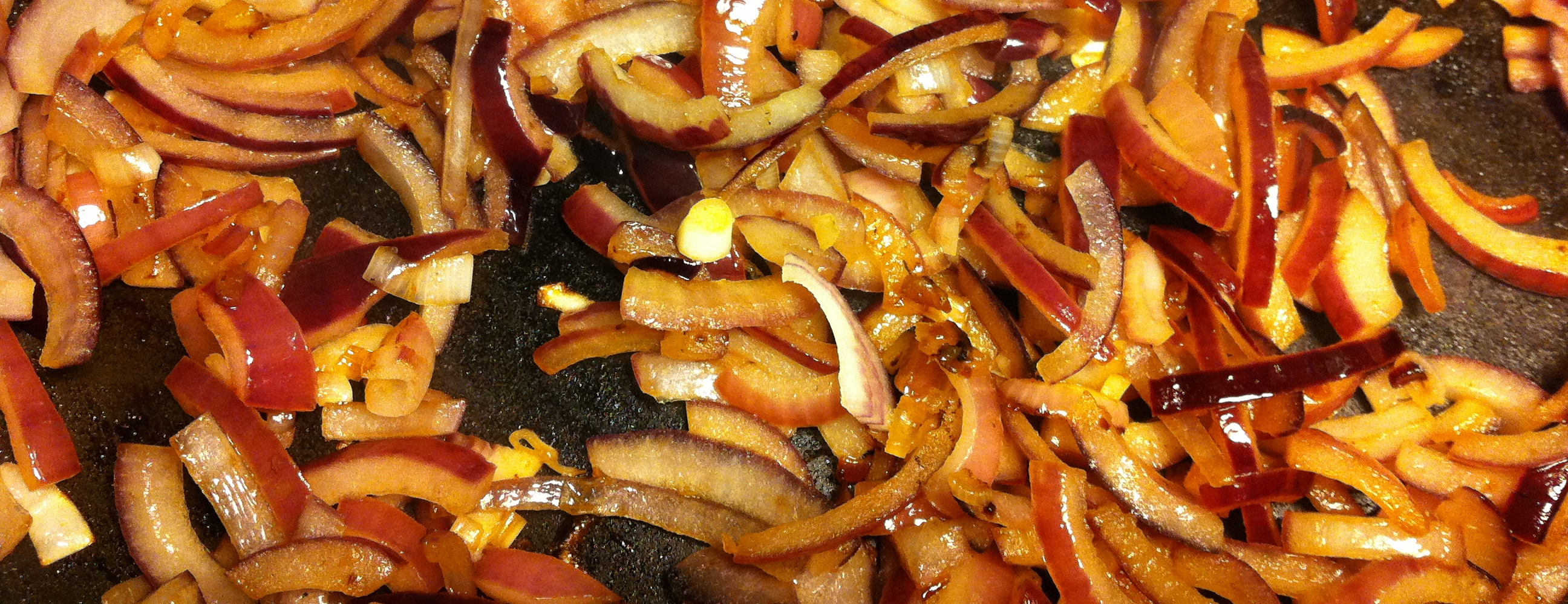 Fry the potatoes in some olive oil until golden and soft. Chop or slice two onions. Fry them as well in olive oil.