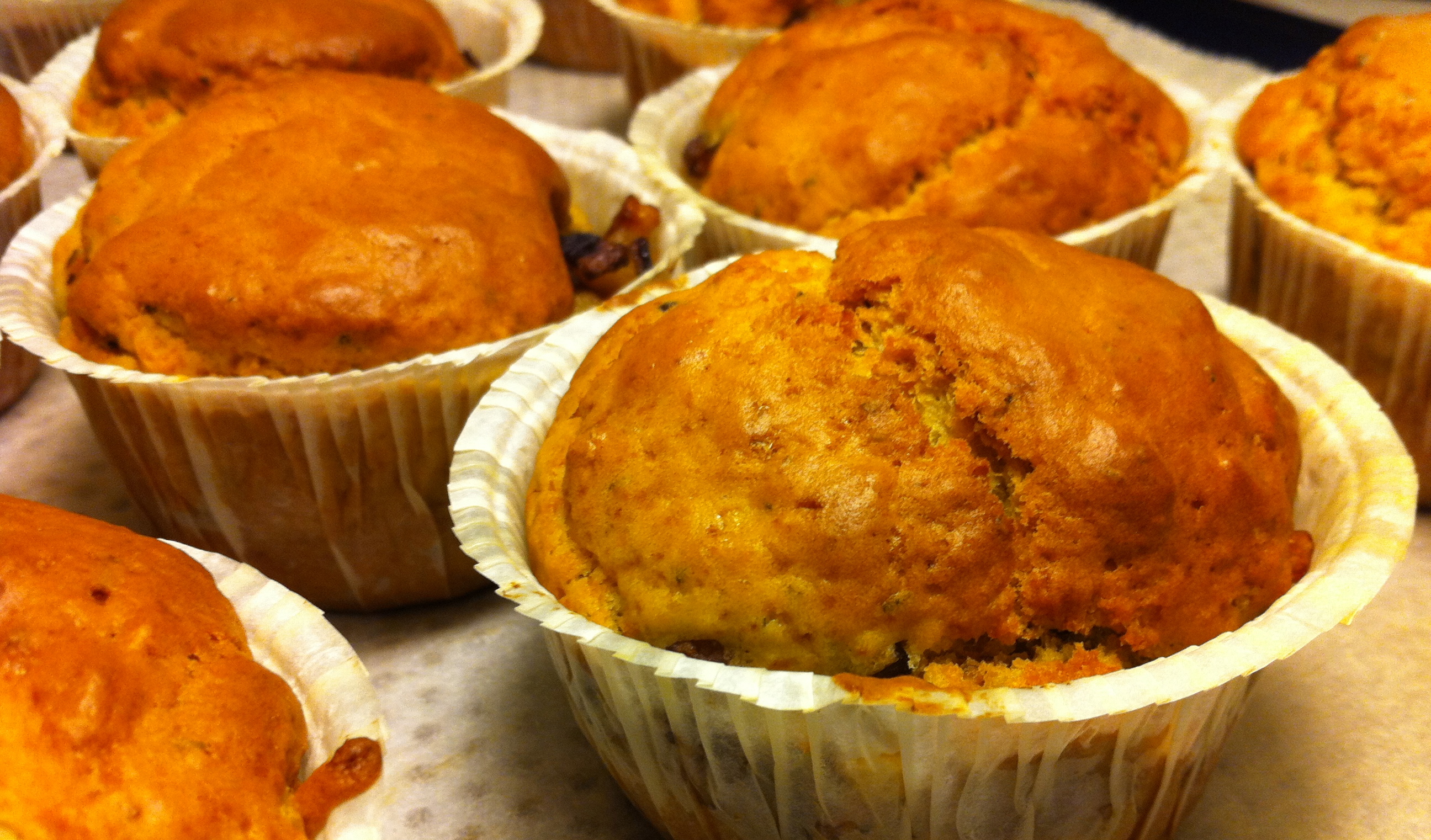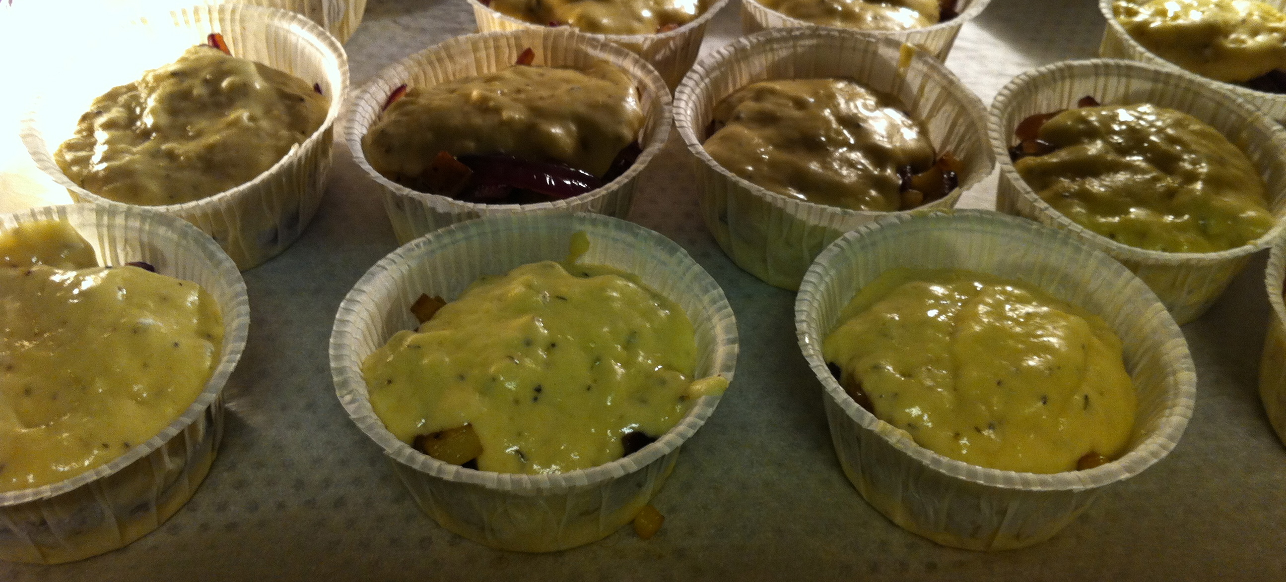 Spoon half of the batter into paper muffin cups. Add a spoon of the filling. Add the rest of the batter on top. Some of the filling may show through. Mrs J figures that’s how your guests will know they’re home made.