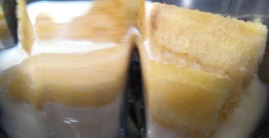 Take a banana and put it in your mixer. Well ripe bananas (read: more black than yellow) work wonderfully in this because they’re naturally very sweet. If you’re a health nut you won’t be adding any sugar or sweetener (but Mrs J does sometimes if the fruit isn’t sweet enough).