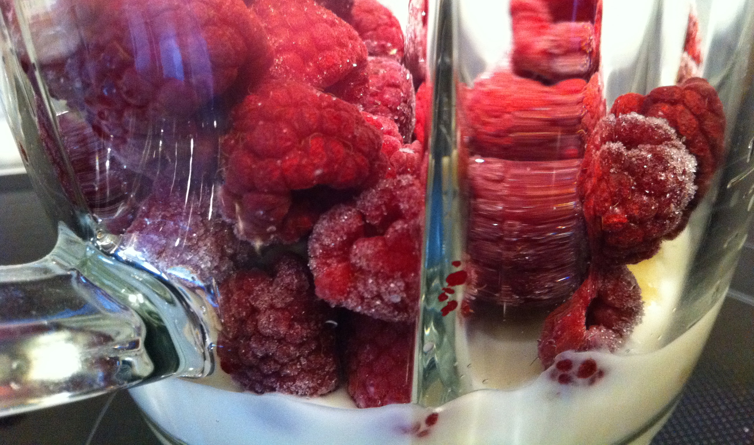 Add some frozen raspberries and some skimmed milk.