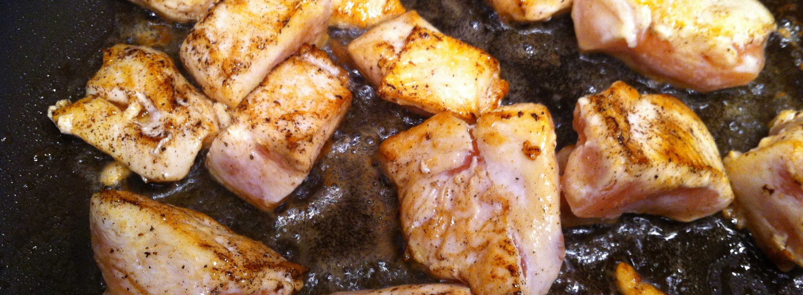 Get some chicken breast and cut in pieces. Alternatively, get some pre-cut frozen chicken breast from the freezer (that’s what Mrs J did). Throw in a pan with some butter and olive oil until just browned. Set aside.