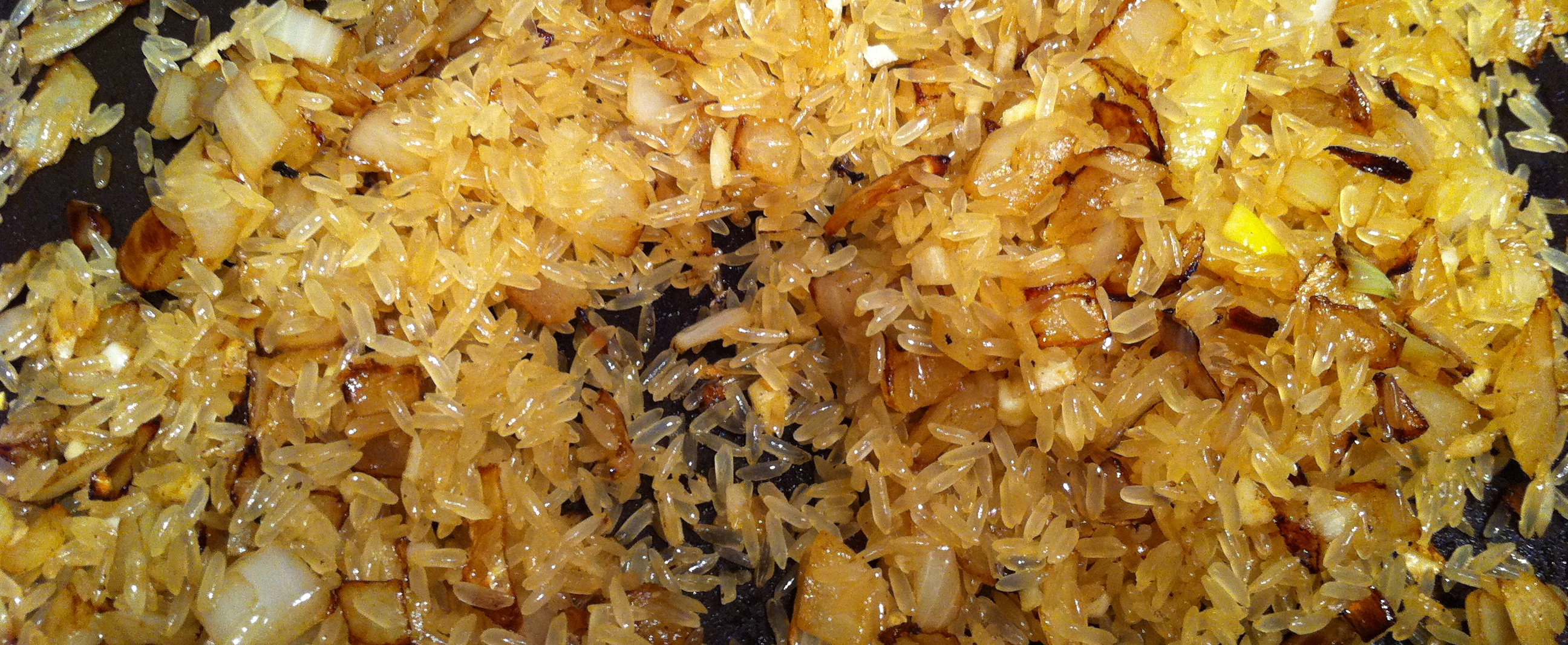 In the same pan throw in some chopped onions. Let them go golden. Add some chopped garlic and let cook for just a minute. Add the rice and let it heat through until the rice looks shiny.