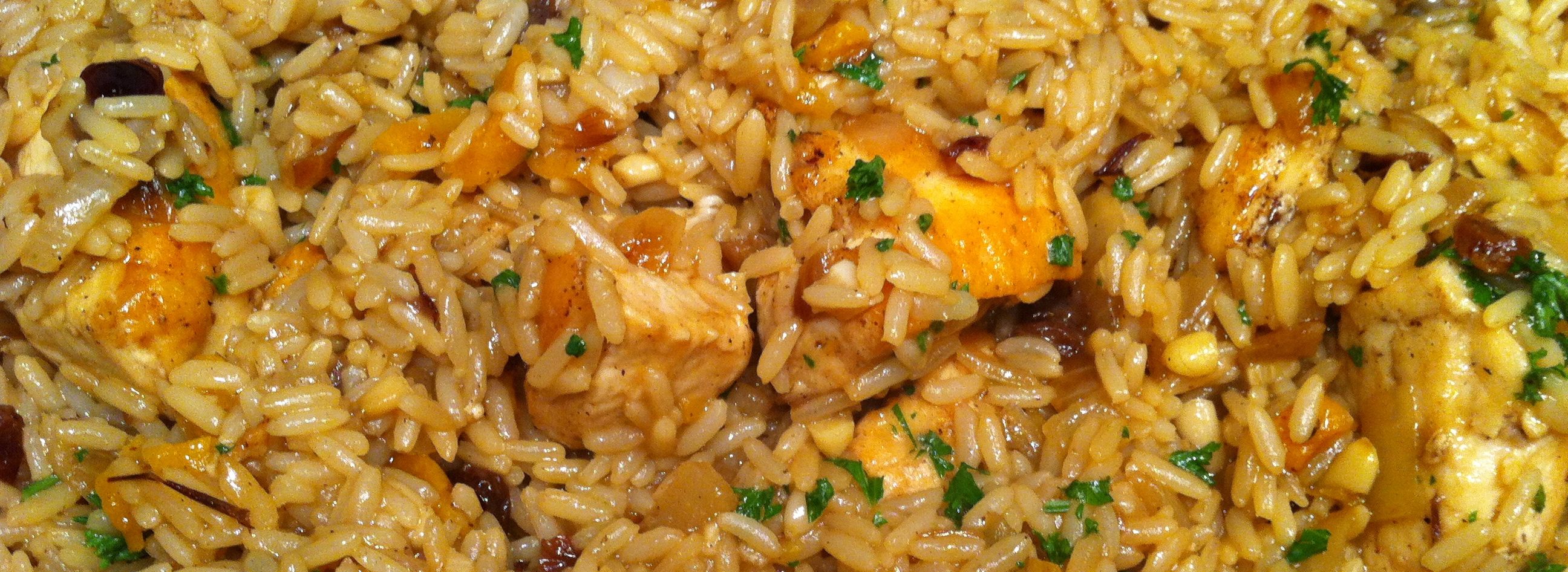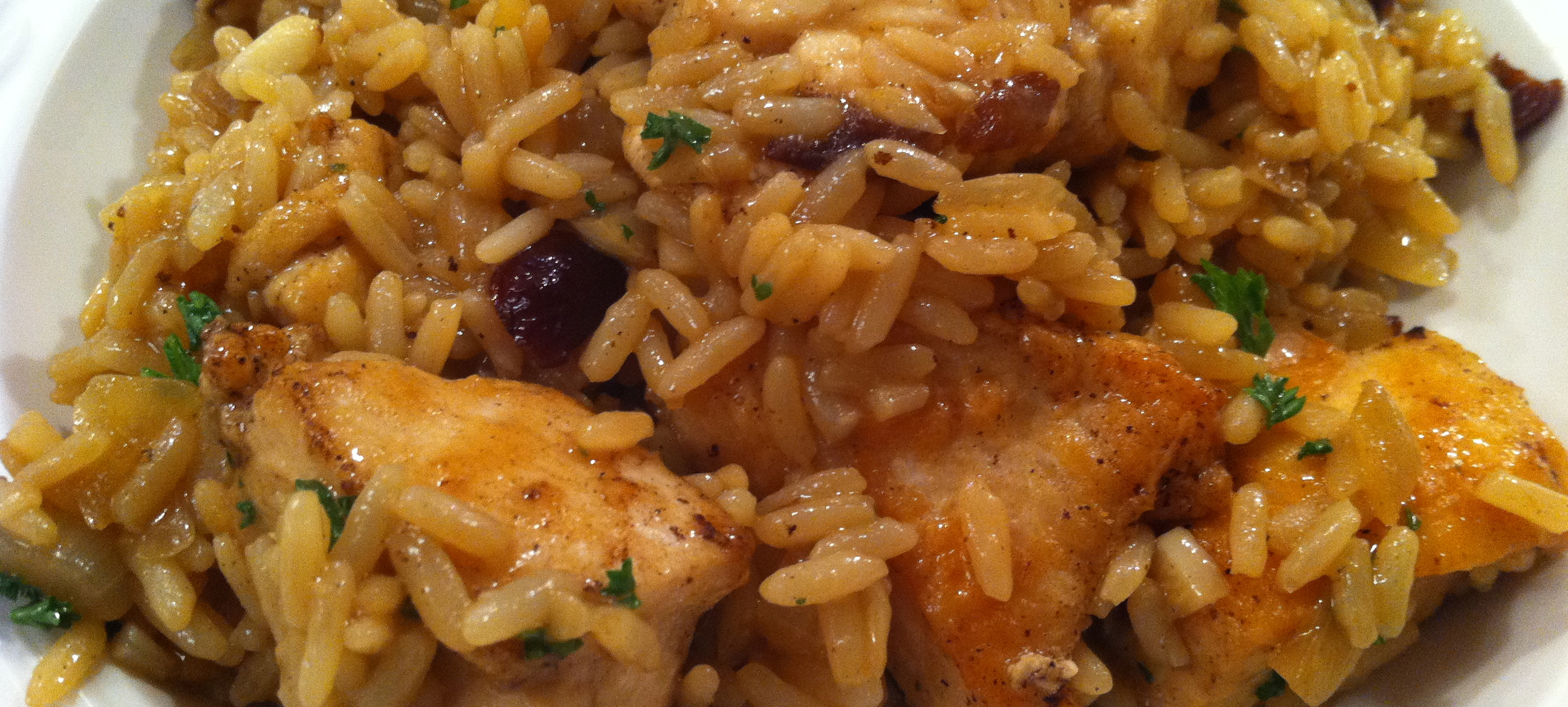 apricots, butter, chicken, chicken stock, comfort food, cranberries, dried fruit, garlic, onions, pine nuts, raisins
