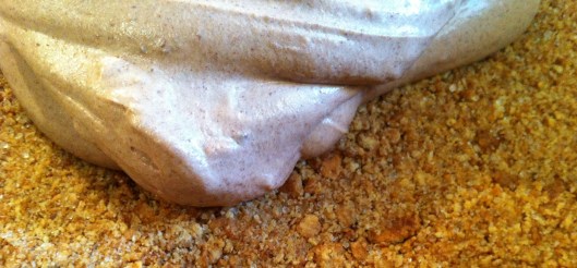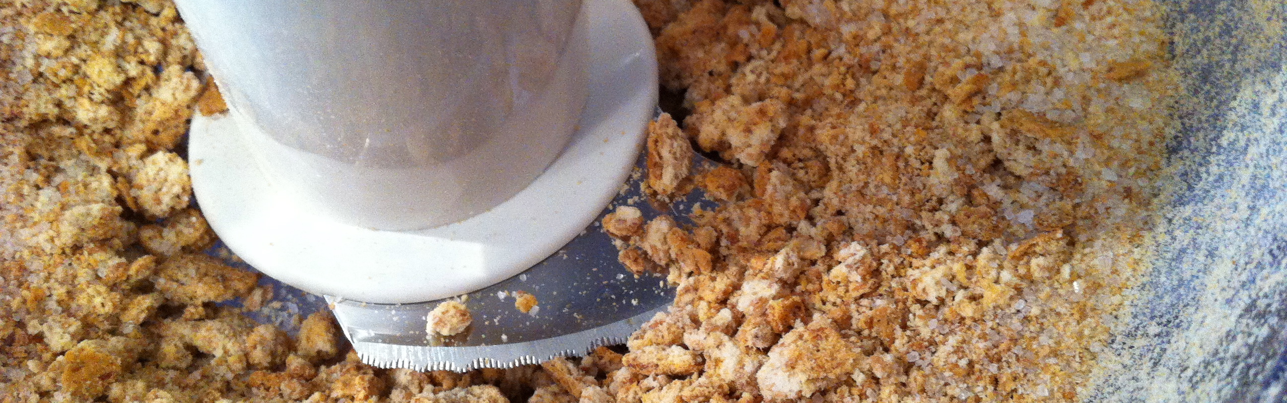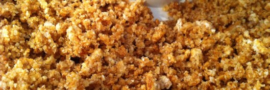 Mrs J used a 28cm pie dish. Start by setting your oven to 150°C. Then go ahead and mix 150g of digestive biscuits (or similar biscuits) with 2 tbsp of sugar, until you have a rather fine dry crumble.