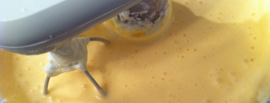 Mix until combined and smooth. Add two eggs and an egg yoke, one at a time while mixing, until the mix is smooth again.