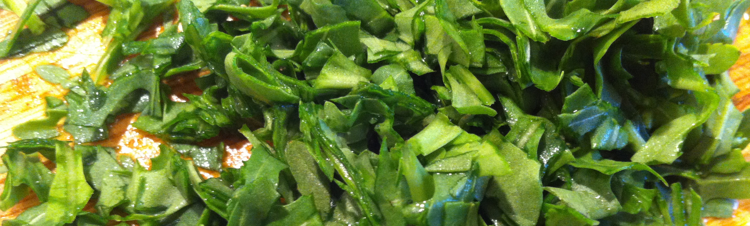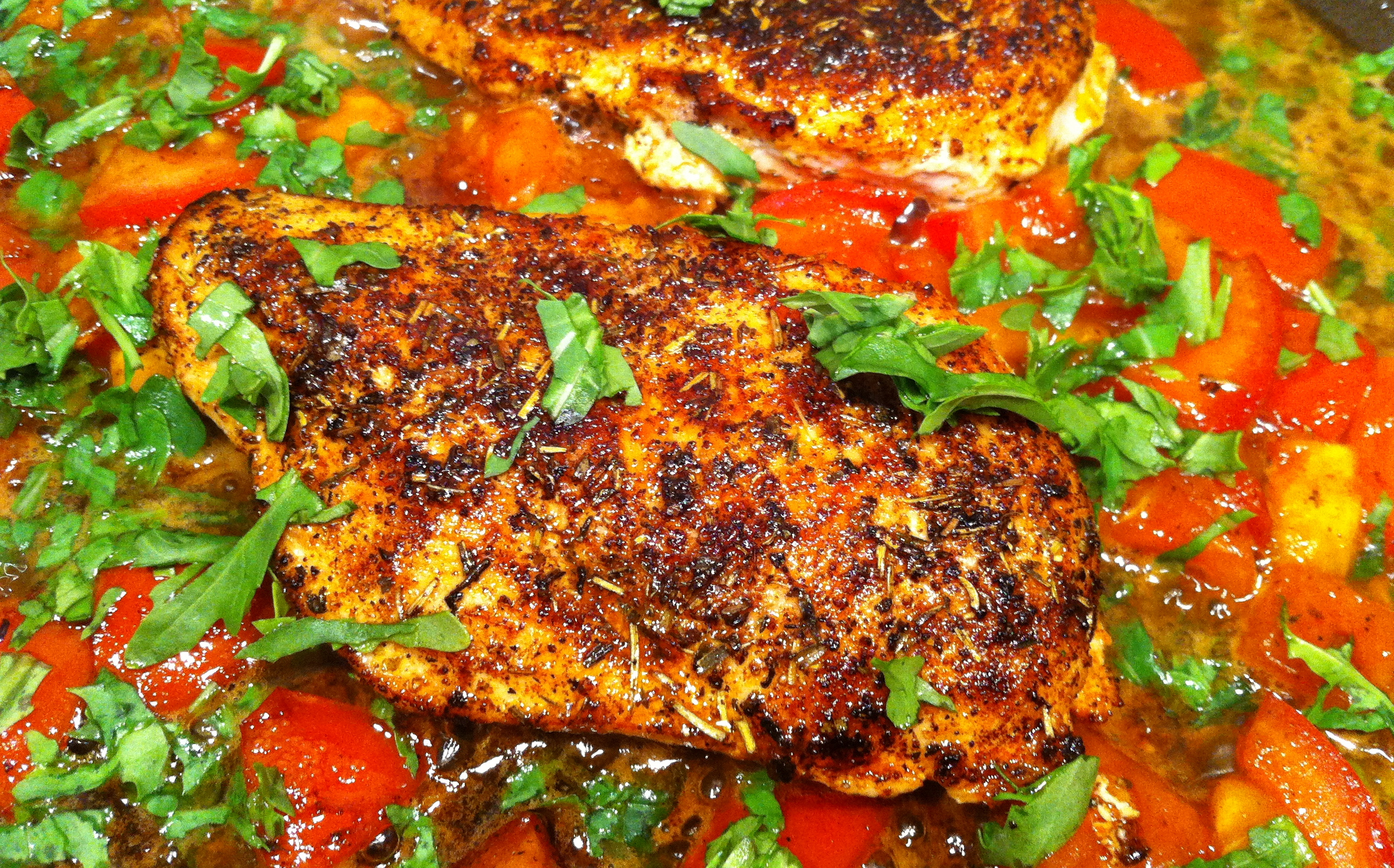 When the sauce is to taste put the chicken breasts back in the pan and cover. Keep on low heat until the chicken breasts are just cooked through. Add a handful of chopped ruccola.