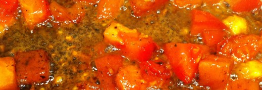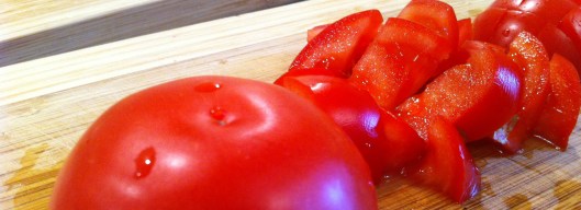 Mrs J wasn’t expecting the queen so she only removed the woody parts of the tomato and didn’t bother to blanch or peel anything. Also add a tablespoon of white balsamic vinegar.