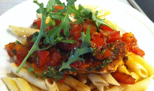 Serve from the pan, which looks quite nice already – or plate the chicken breast over fresh pasta, spooning the sauce over it. Decorate with a few more leaves of ruccola.