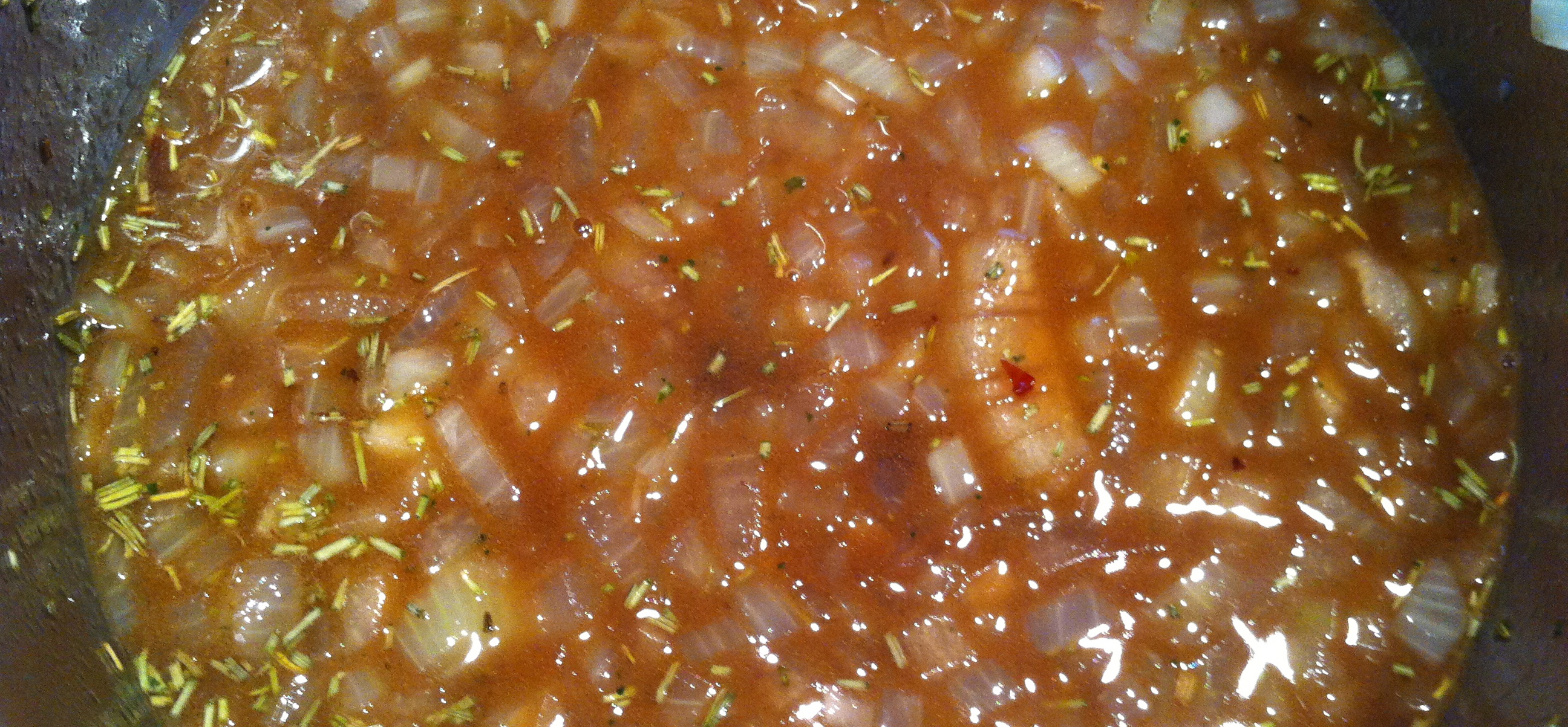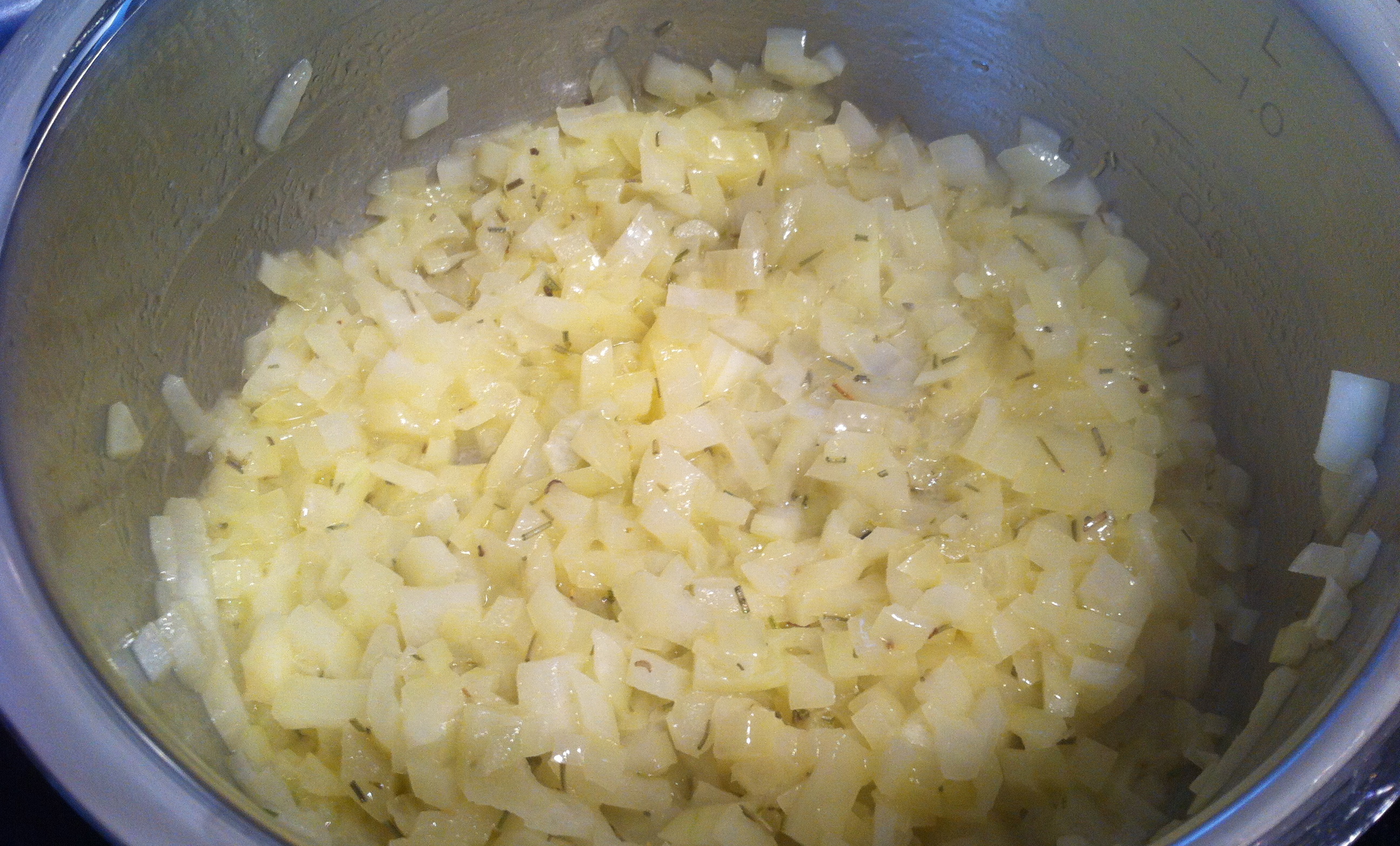 Add one large chopped onion and one tsp of dried rosemary. Cook the onion until it softens.