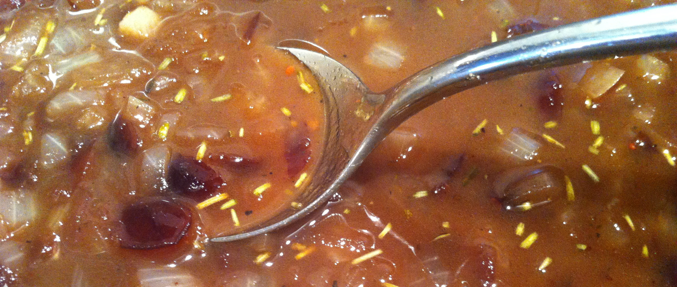 Add 1 1/2 dl of chicken broth, 2 good tablespoons of red currant jelly and about 3/4 dl of chopped dried cranberries.