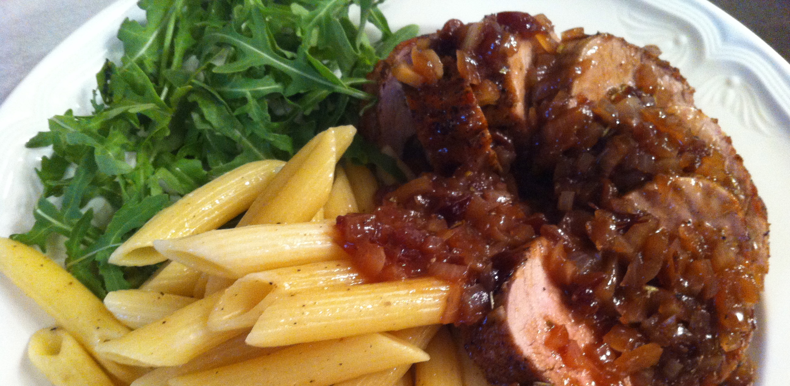 Also add 1 tbsp of red balsamic vinegar and whisk until the jelly melts. Leave on fairly low heat to cook down while you prepare the pork.