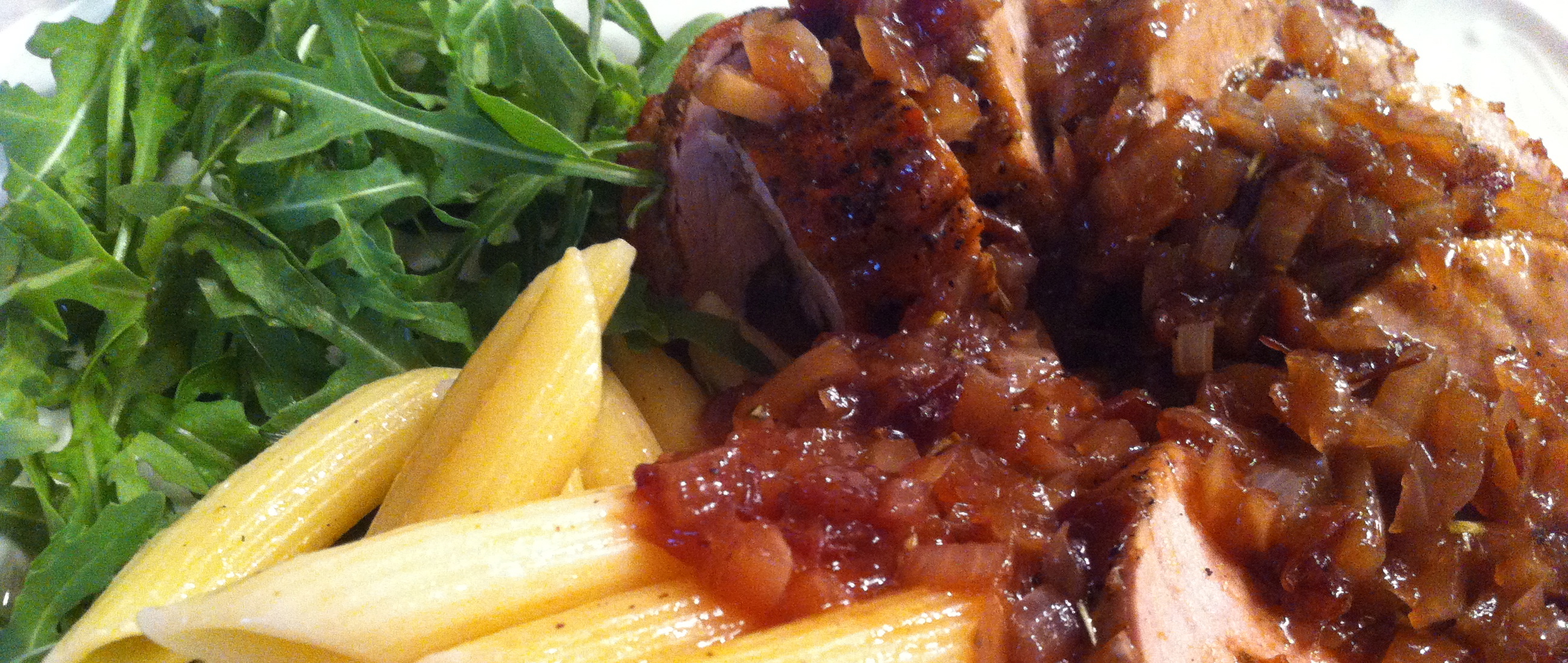 Serve with the sauce spooned over the slices. Some rocket salad balances the sweetness of the sauce nicely.