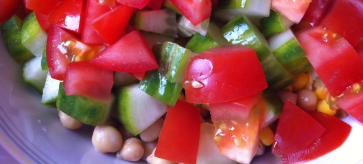 The basis of the salad is canned corn and canned chickpeas, or any kind of canned beans in water. One small can of each, rinsed, in a bowl will do. Cut whatever leftovers of vegetables you have in smallish pieces and add to the corn/beans. Mrs J had a bit of cucumber and a couple of tomatoes. Bell peppers work well too.