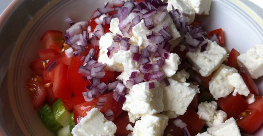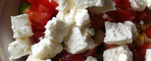 Then you can add your choice of cheese. Depending on the cheese you have left over. Mrs J has made this salad with mozzarella cheese, for example. This time she had some feta cheese left.
