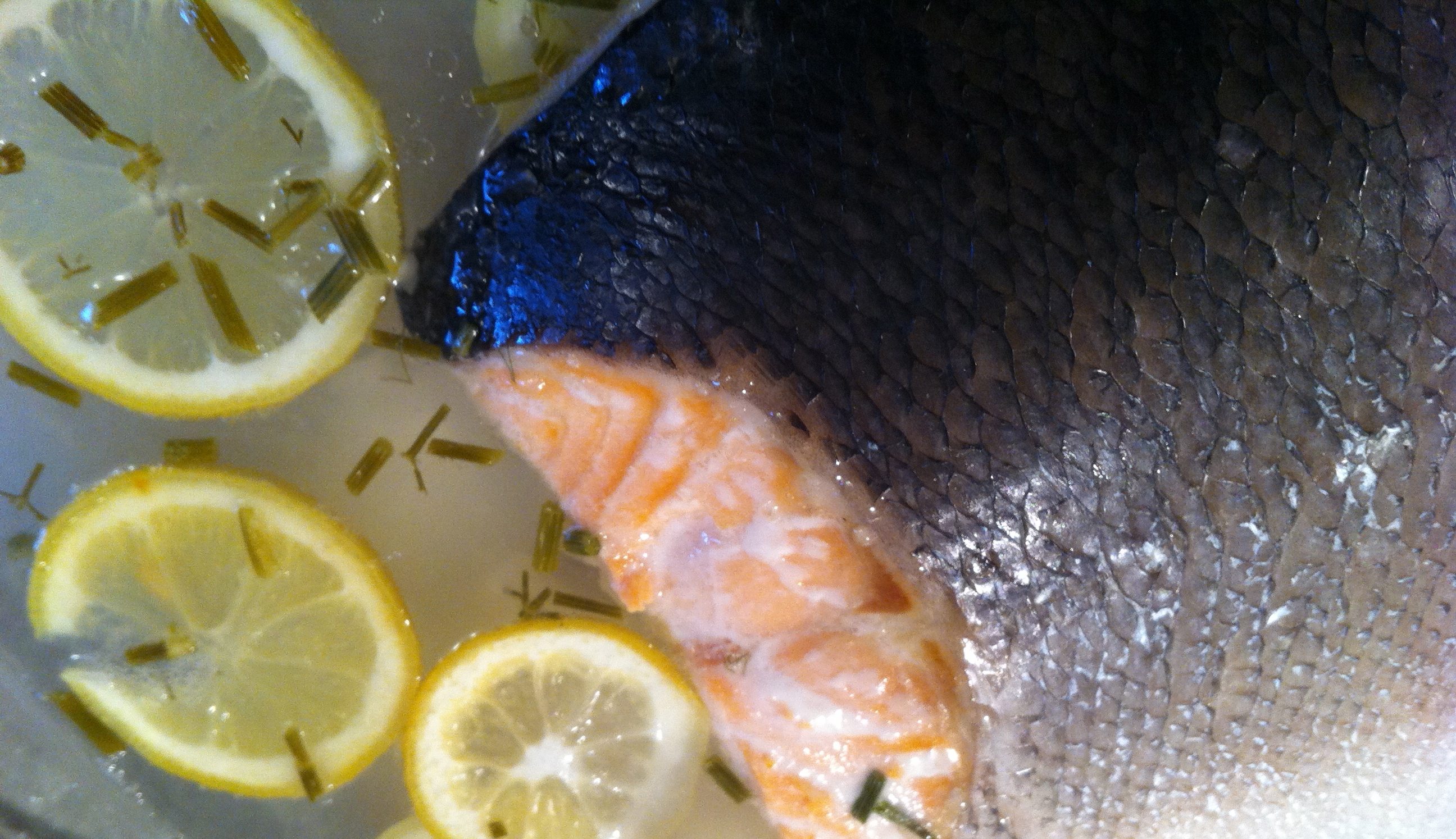 Place the salmon on top of the lemon slices, skin side up, and pour over the hot liquid. Put the whole thing in the oven for about 35 minutes. For info, the water is not supposed to boil in the oven, there should just be enough heat to cook the salmon through, slowly, gently.