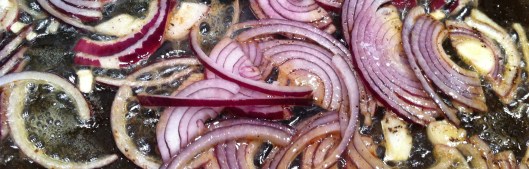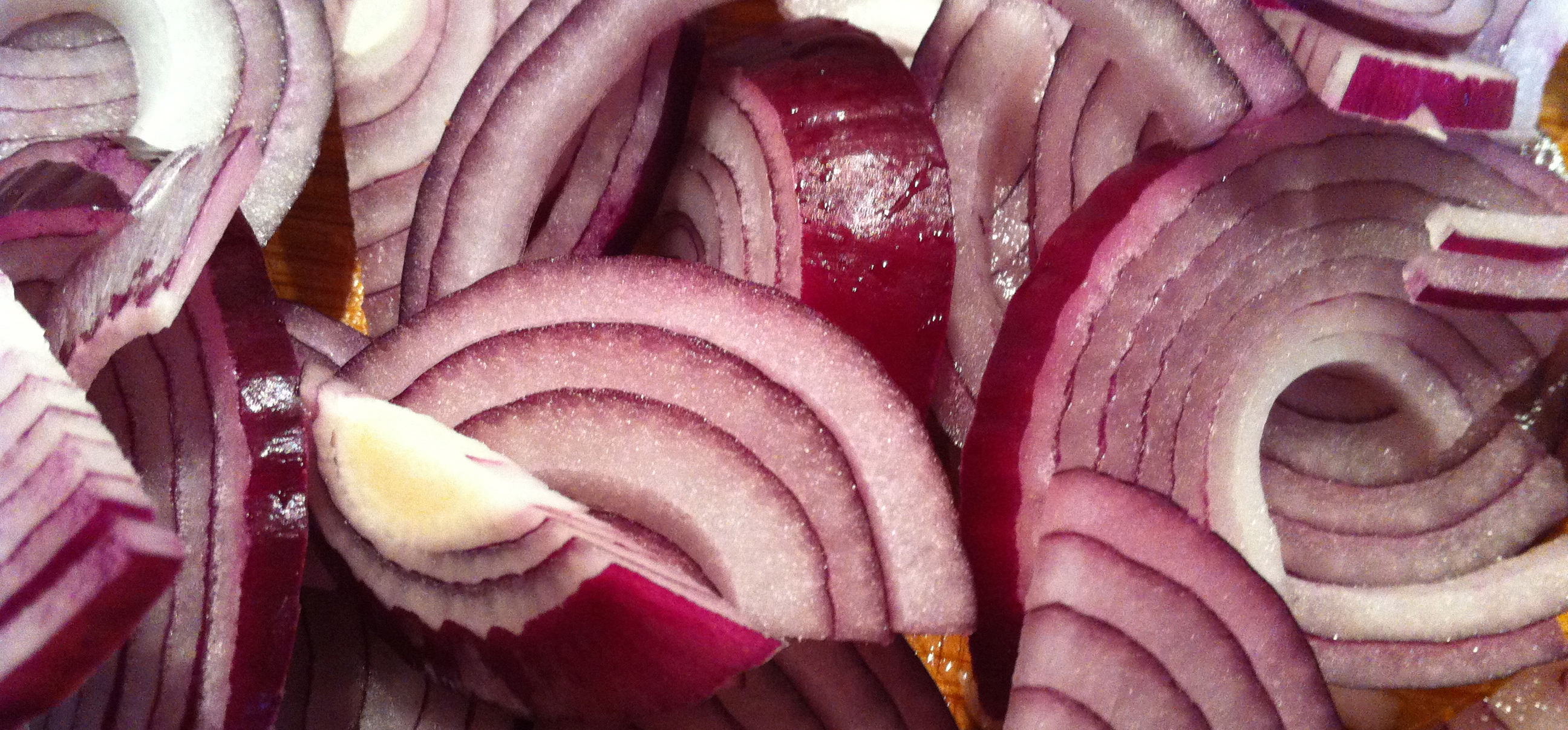 Here’s how you make it. Dice two chicken breasts. (Mrs J will spare you the picture of raw chicken breast. Let’s face it, raw chicken doesn’t look all that great.) Also, cut a large red onion in half and slice.