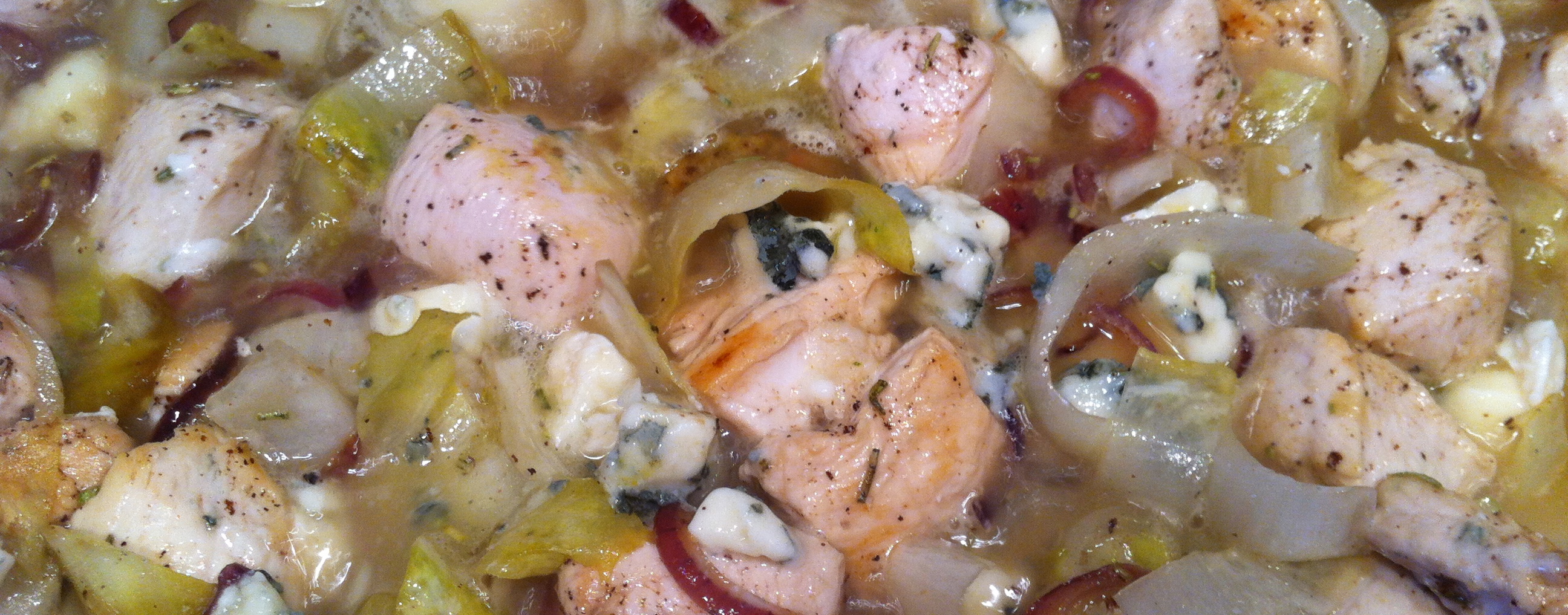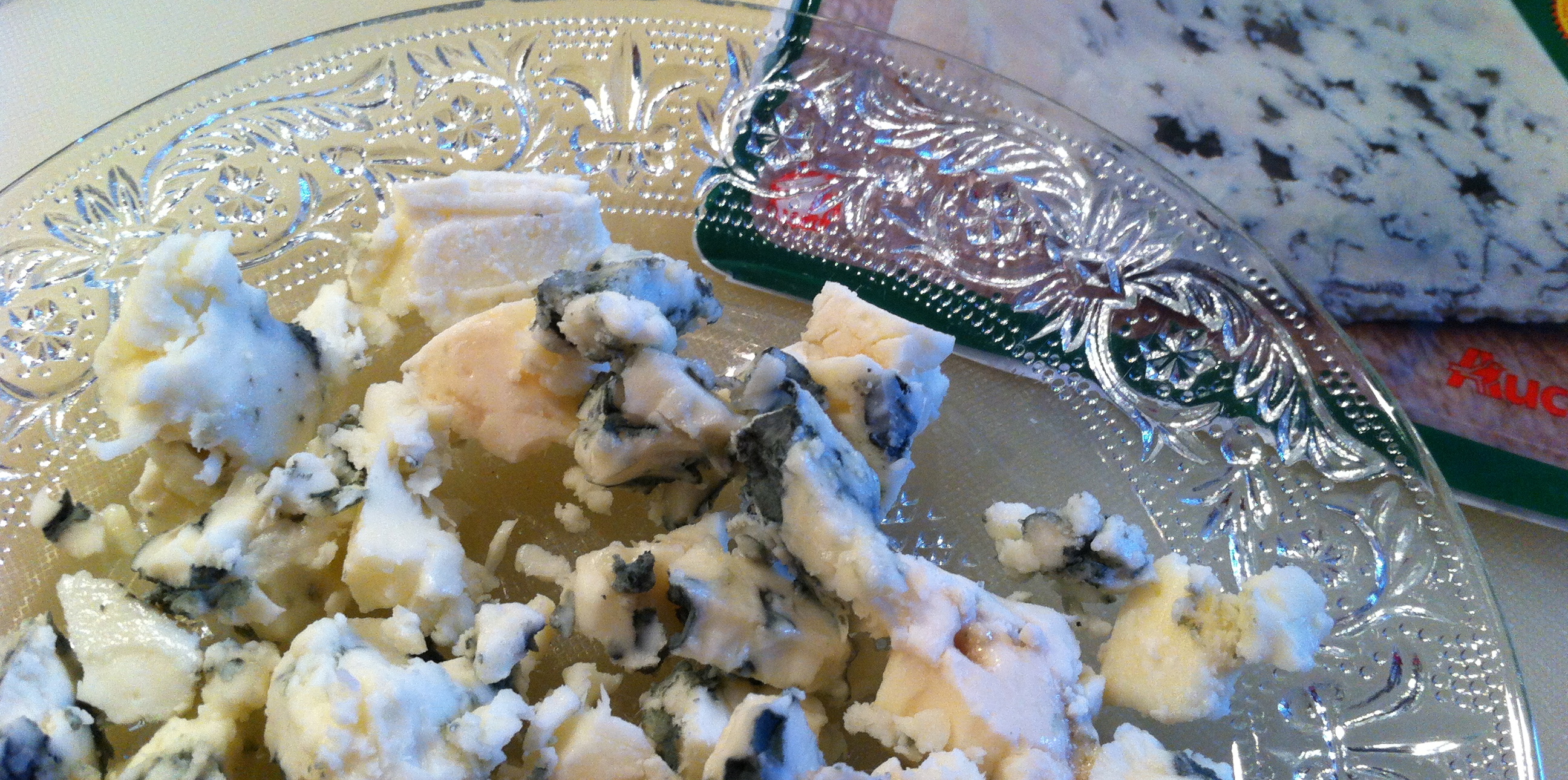 Add 2 dl of double strength chicken stock and crumbled roquefort cheese.