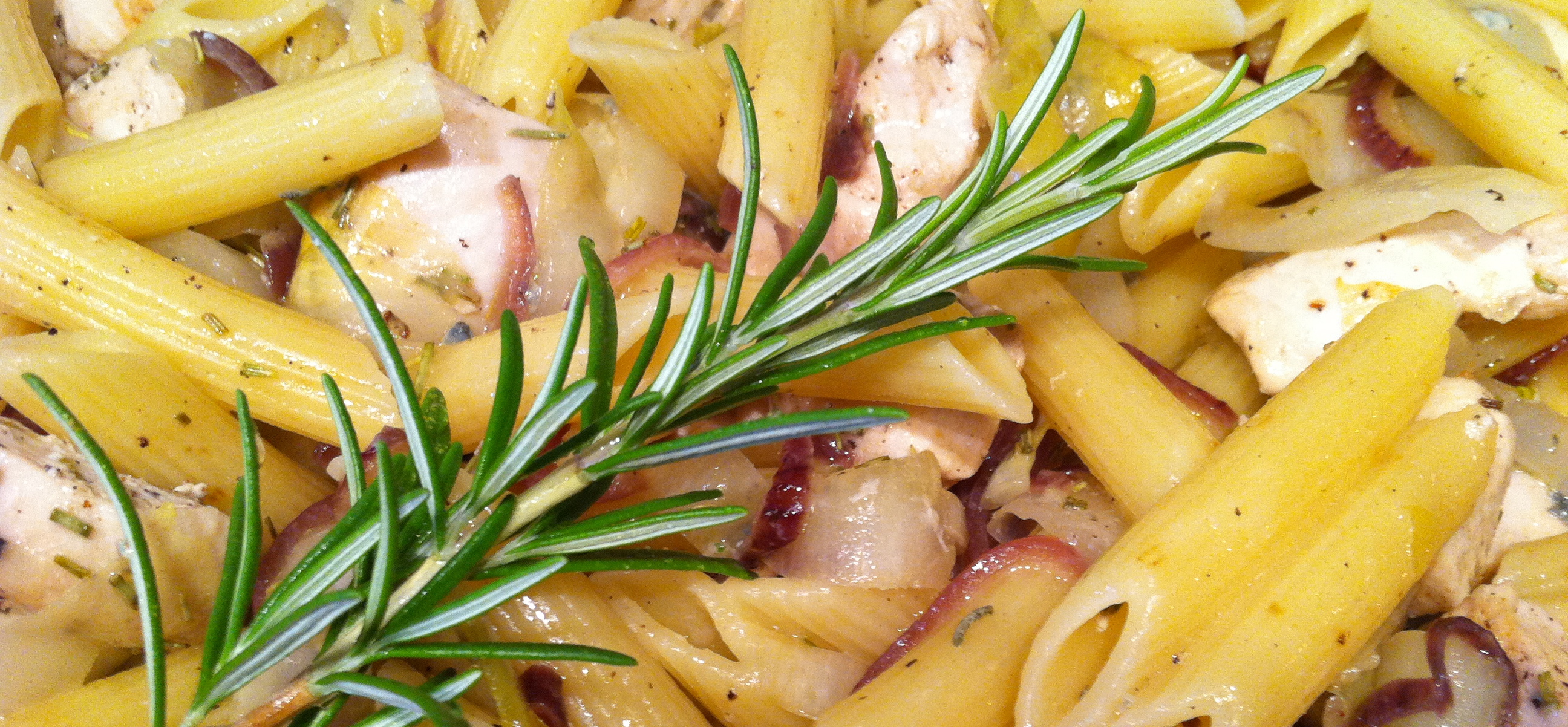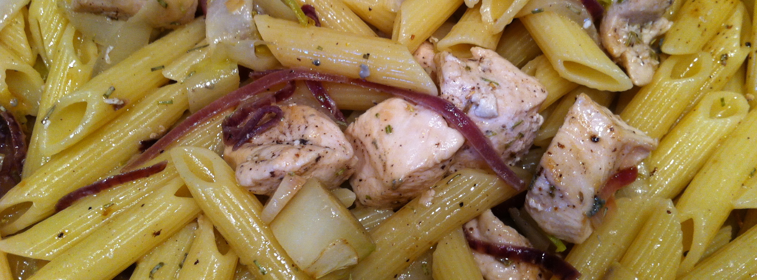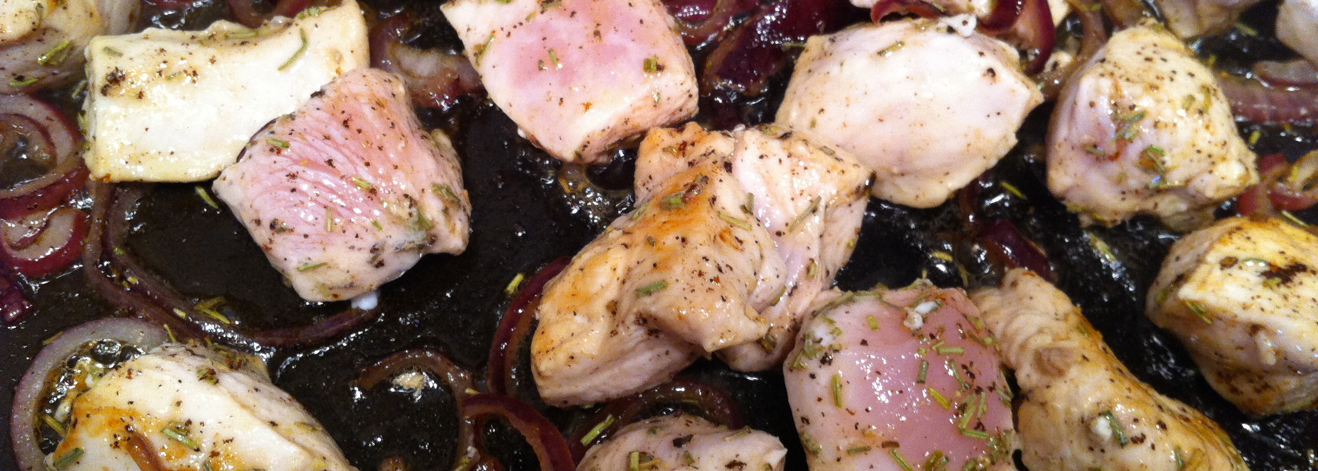 Turn the heat down slightly. Add the cubed chicken. Let fry to slightly brown the chicken and make sure the onions go soft. Season with a good pinch of salt, black pepper and about a teaspoon of dried rosemary.