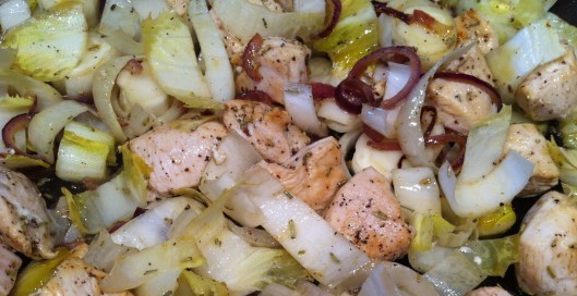 Add the endives. Let fry together with the chicken and onions for a minute. The good thing about endives is that they don’t disintegrate that easily, so you can fry them for a minute without any problem.