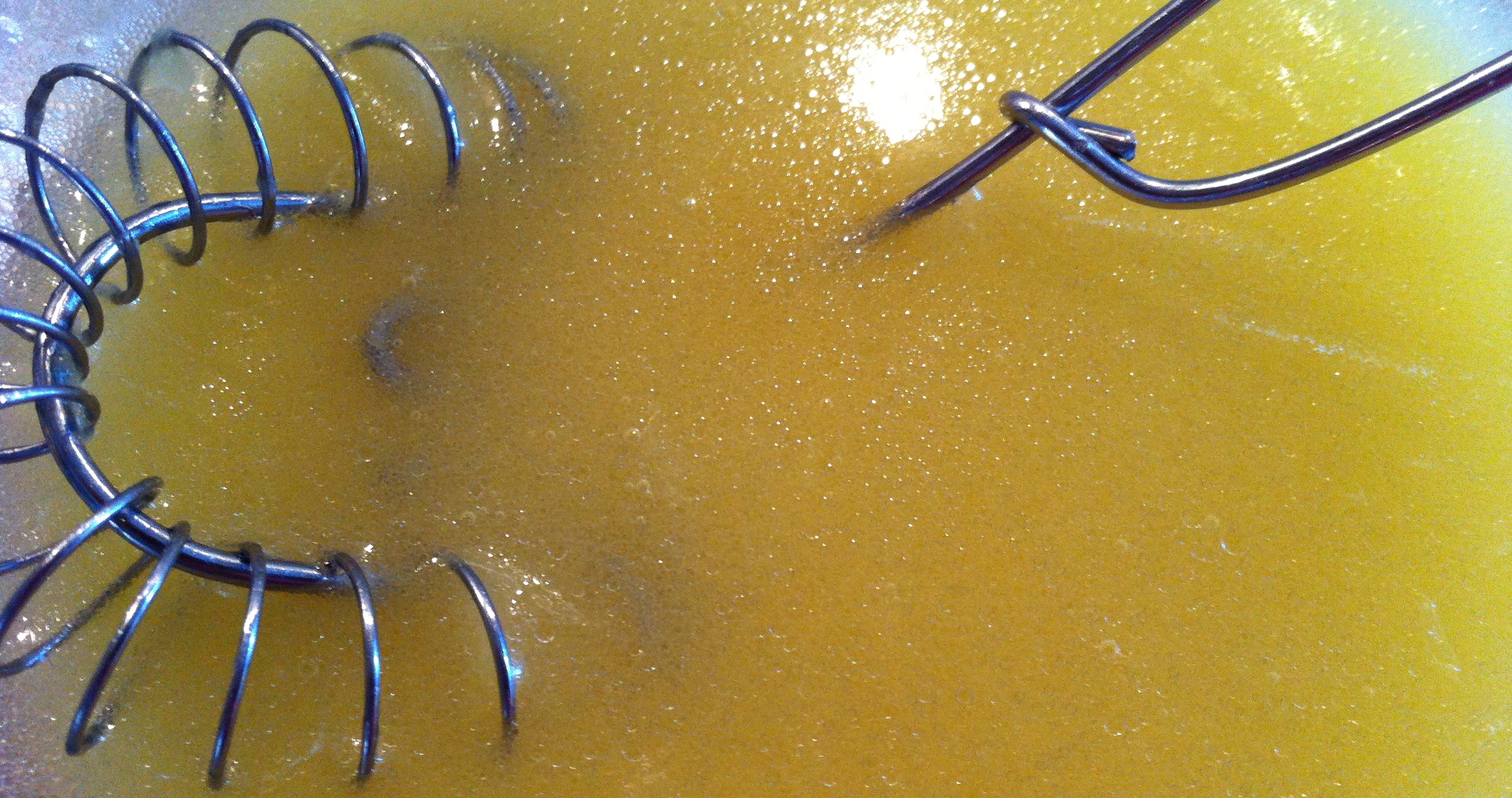 You should try to catch the juice from the oranges while you’re doing the cutting etc. But if you’re a klutz like Mrs J, you may want to have some good orange juice on hand to top up. You need about 2/3 dl in total. Press two limes and add the lime juice to the orange juice. Add about 3 tbsp of sunflower oil and 1 tsp of salt. Whisk and set the juice mix aside.
