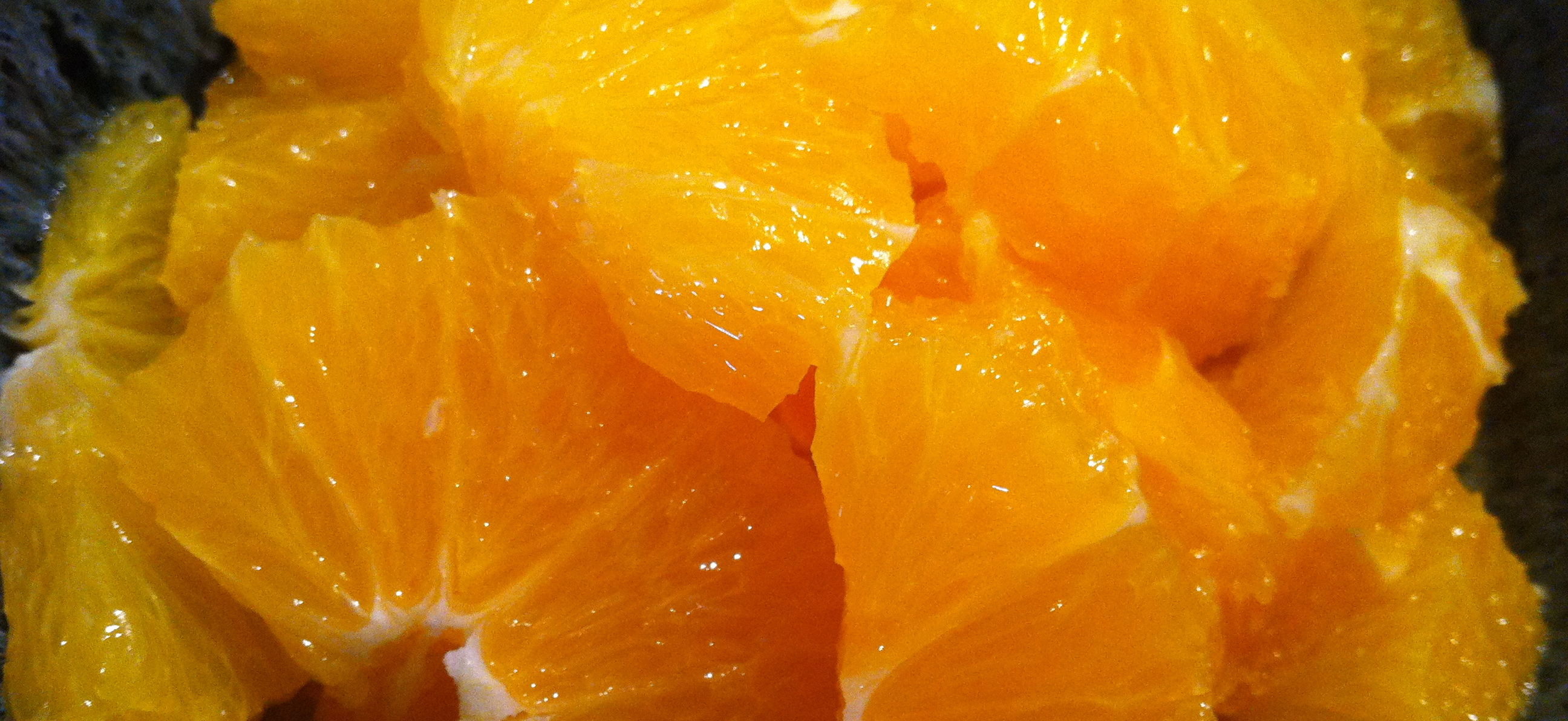 Get two oranges and remove the peel and the white membrane as much as you have the patience for, using whatever method you prefer. Mrs J peeled, cut, ringed and cut again. Set the finished pieces of orange aside.