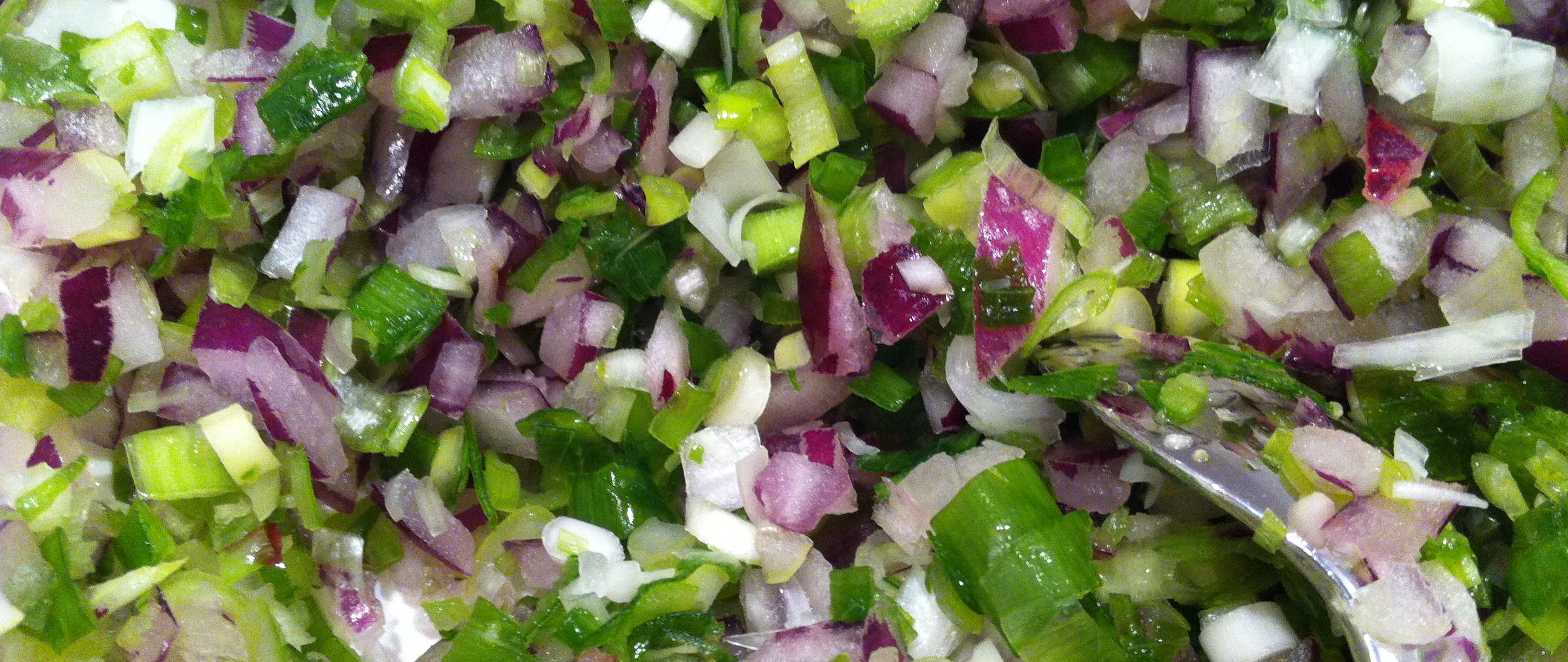 While the rice is cooling, chop one red onion and six salad onions quite finely.
