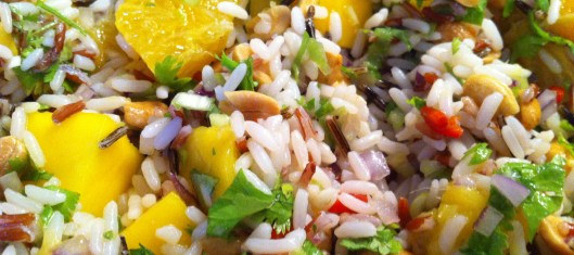 Today the cat sitters arrived. Because the cat sitters are very nice, both to cats and to Mrs J, she decided to try something new on them for dinner. So here’s Mrs J’s take on a cool three rice salad with orange and mango.