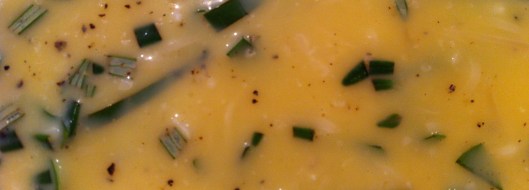 Mix 3 eggs with 2 dl of full fat milk, the chopped herbs and 2 1/2 dl of grated Gruyère cheese. Mix in two tsp of salt and go to town on the black pepper mill, as much as you dare.