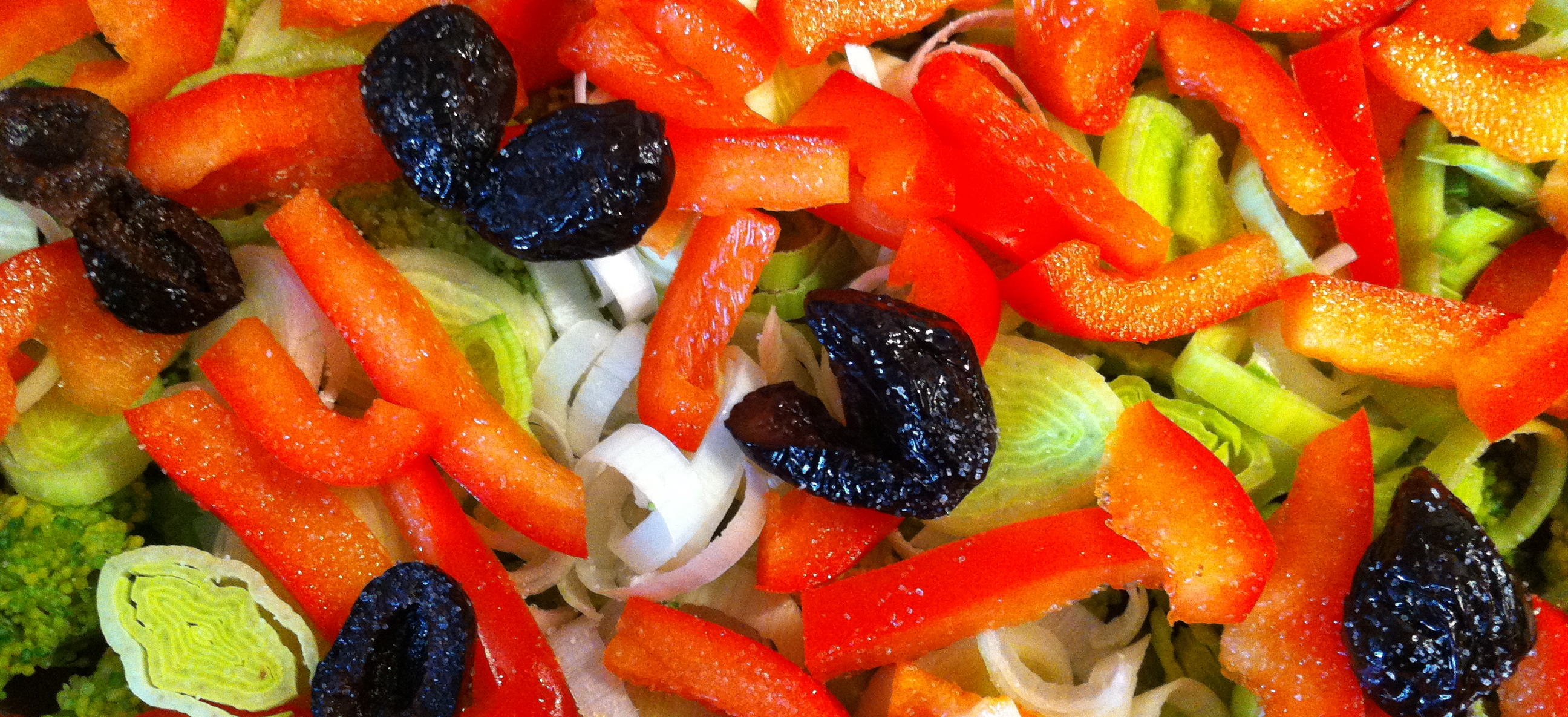 Put another 1 dl of Gruyère straight onto the precooked pie shell. Add the broccoli, bell pepper, leek and olives.