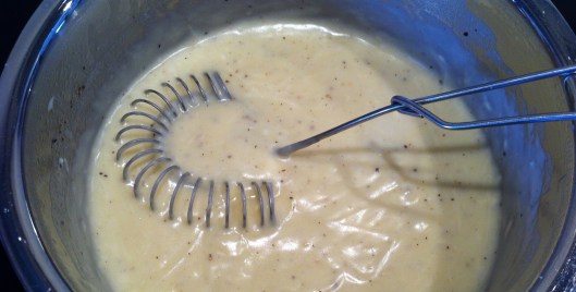 Start by making a thick cheese sauce. Mrs J brought a tbsp of butter and 2 tbsp of flour to the boil with some water and a splash of milk. Lowering the heat she then added grated Emmenthaler cheese by the handful for a very thick sauce. Season with salt and pepper and set to the side.