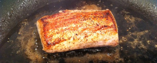 Cut your pork tenderloin into portion sized pieces. Get a frying pan going until it’s really hot. Add a knob of butter and quickly brown the pork on all sides. Season with salt and pepper.