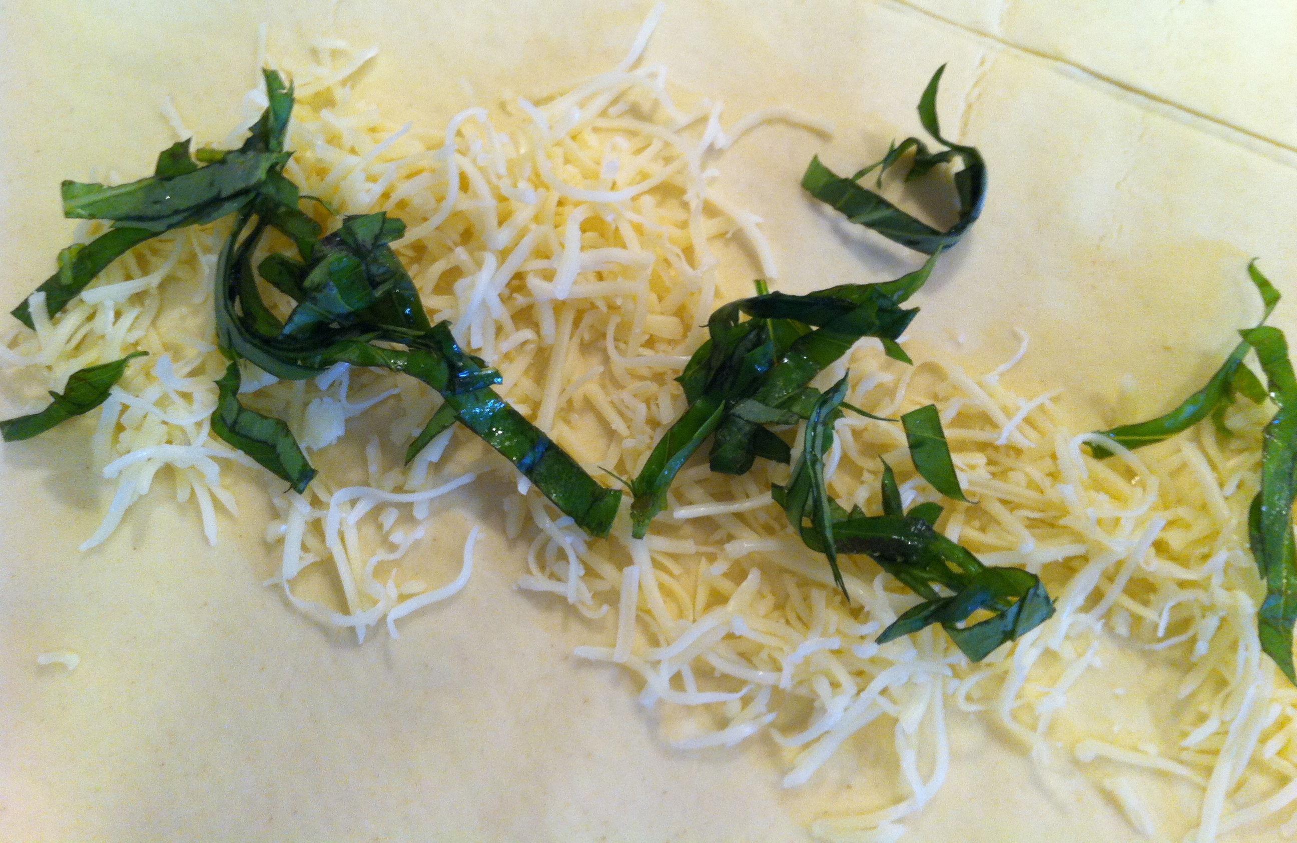Now roll out puff pastry. You want fairly rectangular pieces, big enough to wrap around your pieces of meat. Put some grated Emmenthaler on each piece. Follow up with some chopped fresh basil.