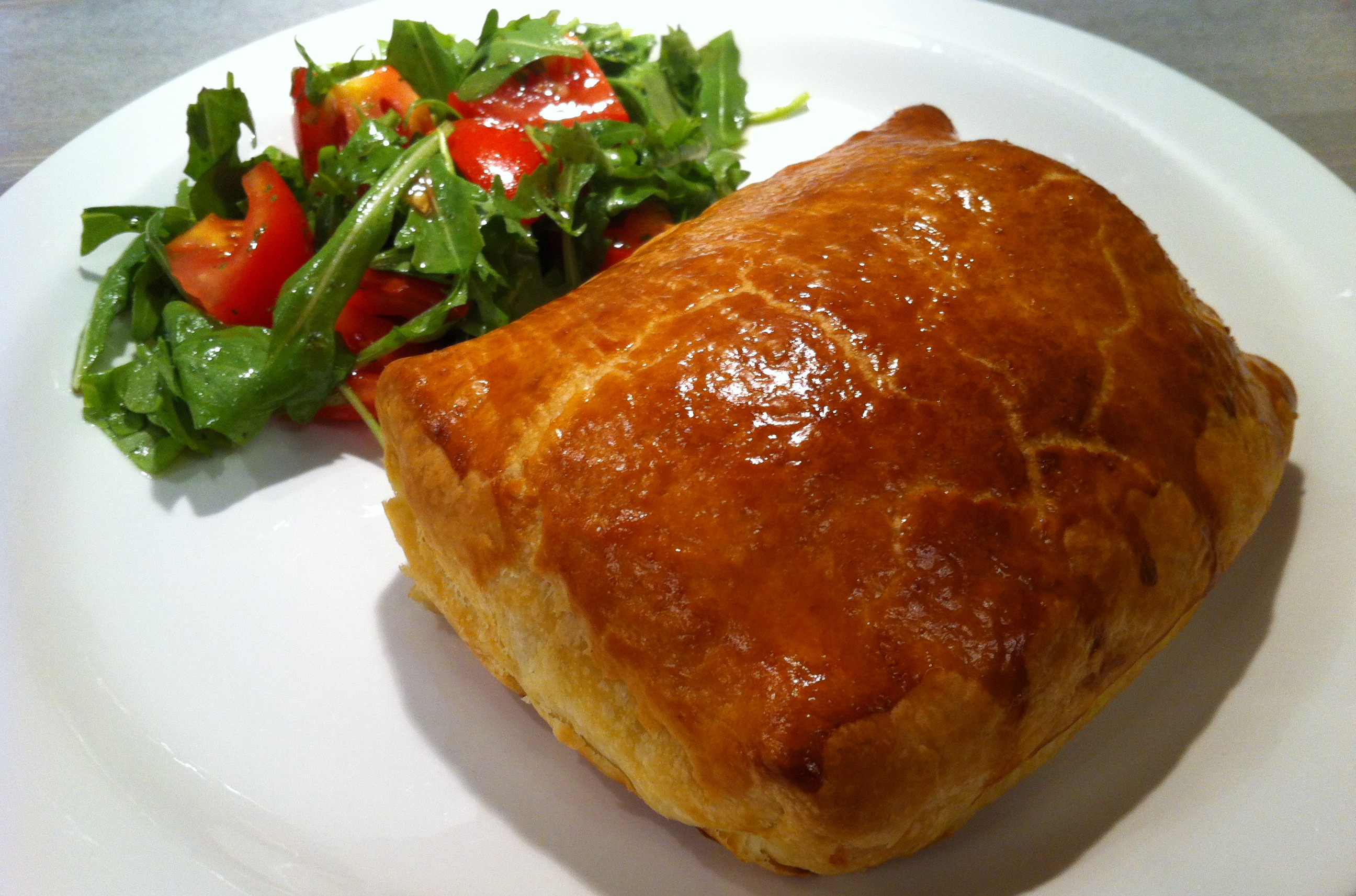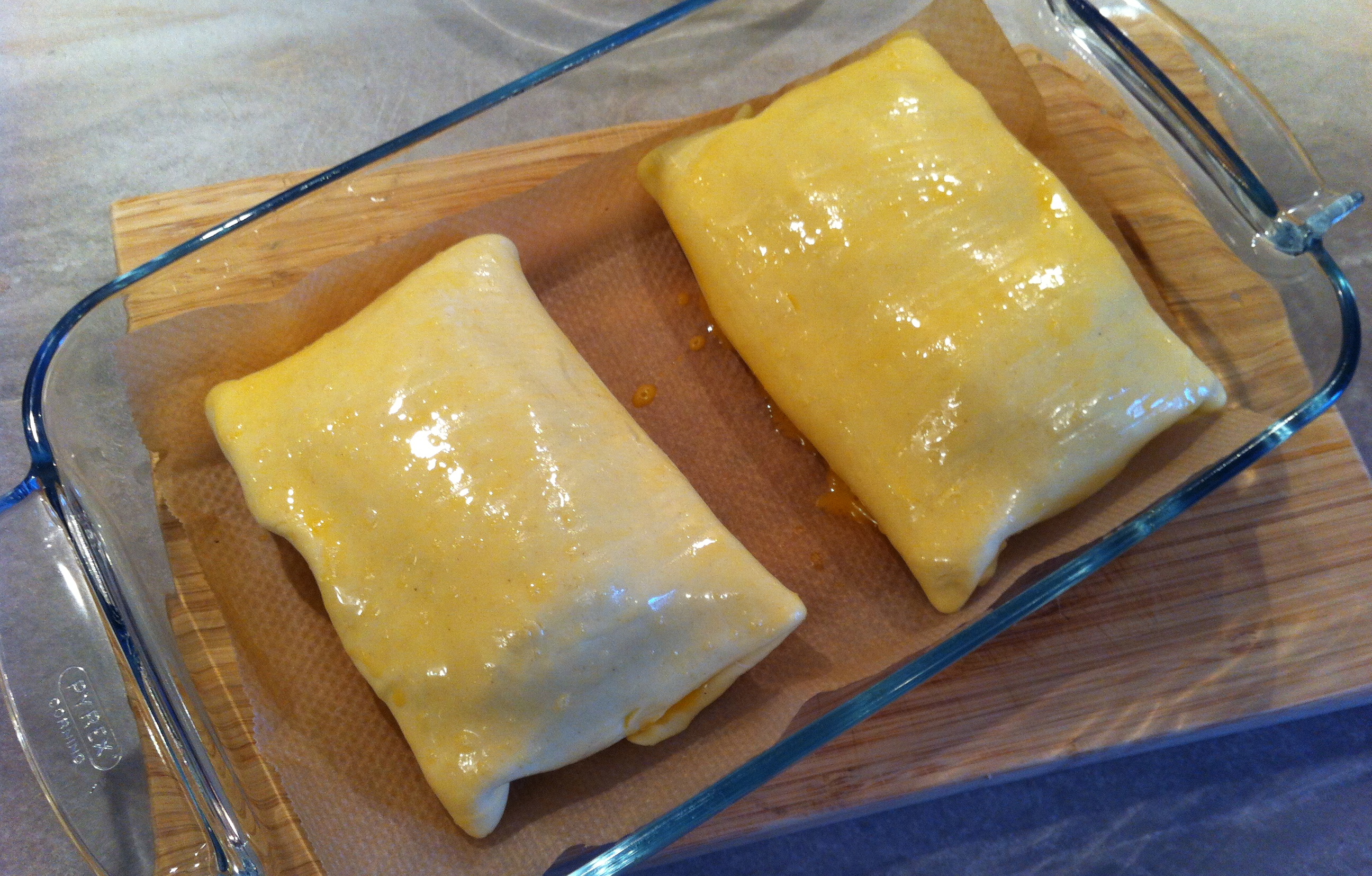 Pop the meat on the cheese, spread a good amount of cheese sauce on top and wrap the pastry around the whole thing. Nip the dough together to avoid the packages leaking. Give them an egg wash before sending them into the oven at 200°C.
