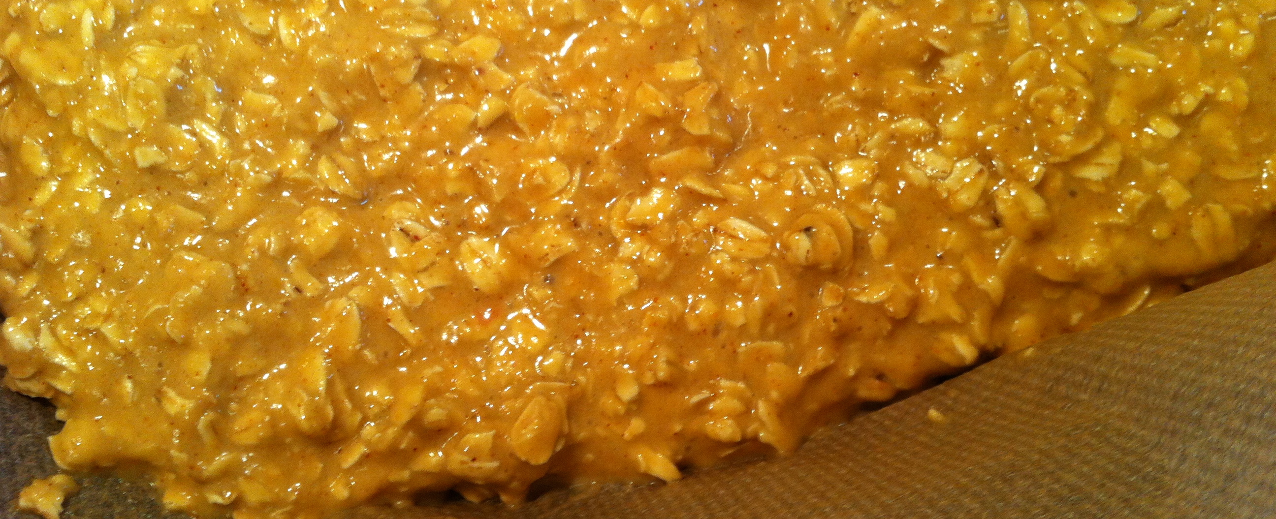 Pour the wet mix over the dry mix and make sure you have an even batter. Spread it into a baking dish lined with oven proof paper. Any part of the pan that’s not covered by the paper should be oiled lightly.