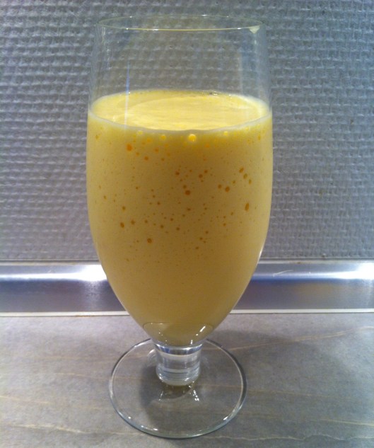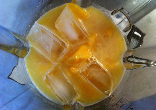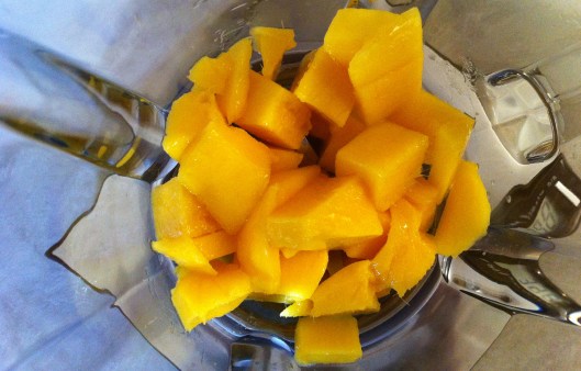 One mango makes two good sized smoothies (we’re talking 260-280g of peeled and diced mango). Just put the diced fruit in your mixer.