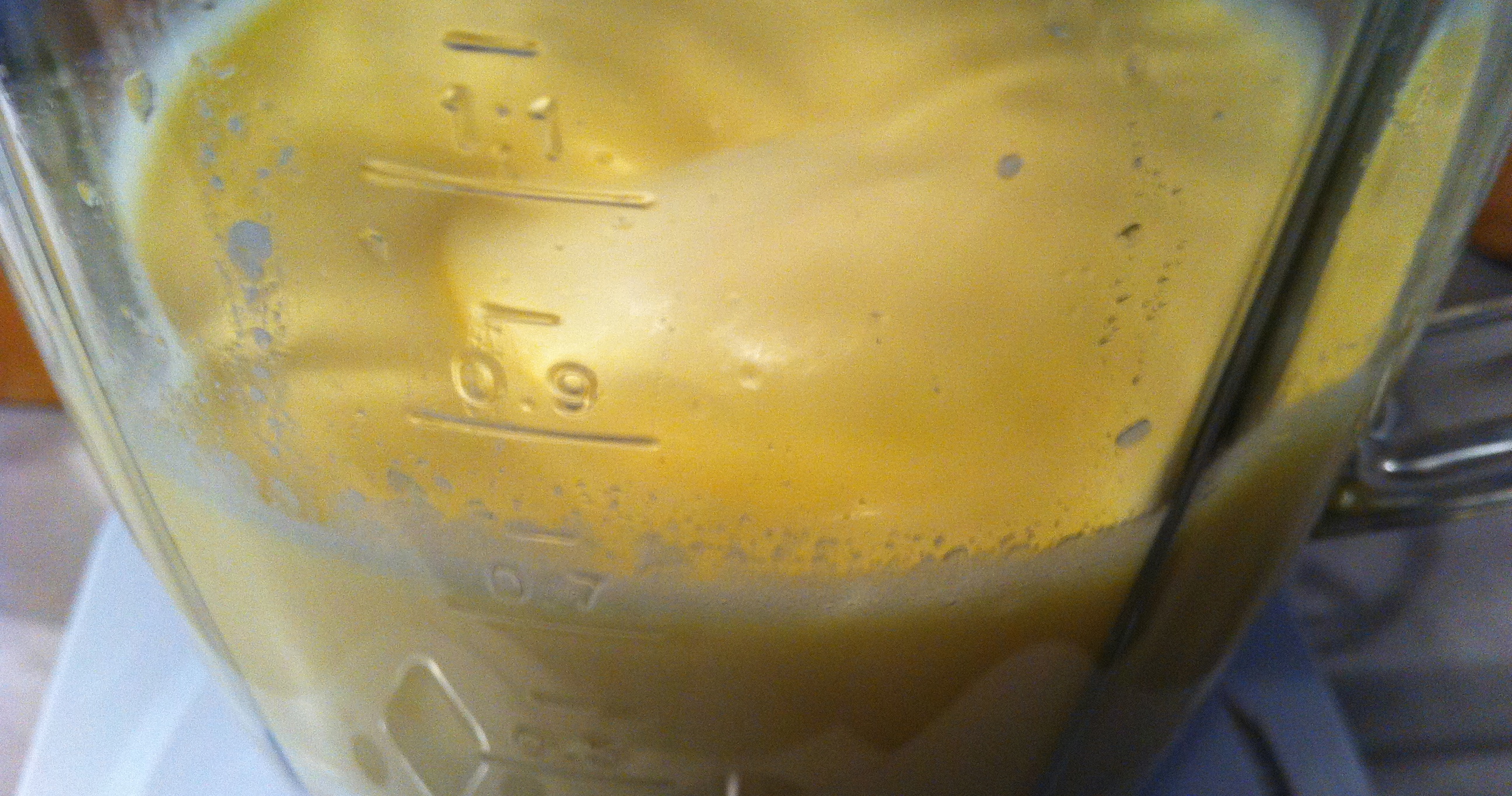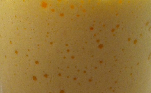 Add 20g of protein powder (neutral flavour) and 2dl of orange juice. Mrs J used Tropicana pure premium juice today instead of squeezing her own. If you feel up for it by all means squeeze away though.