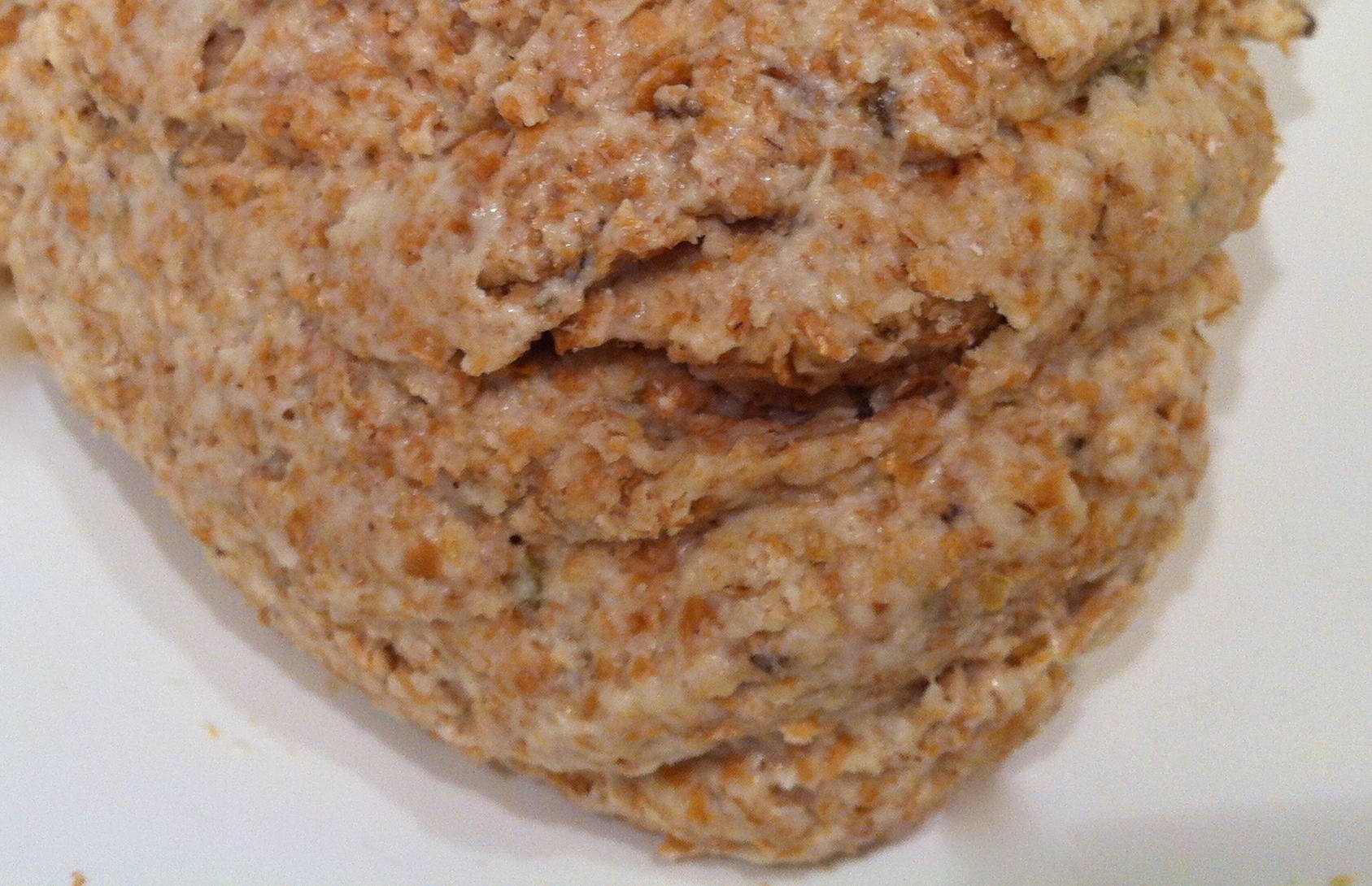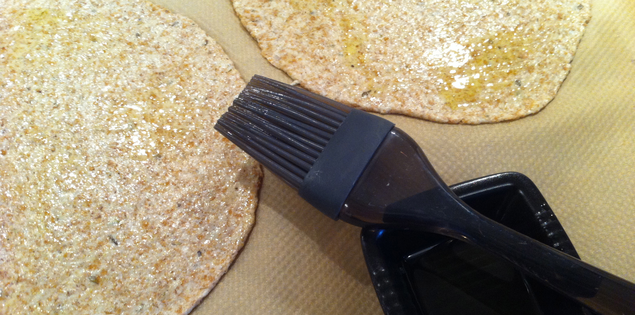 Combine 130g of whole wheat flour with 1 tsp of baking powder. Add 1/2 tsp of salt and 1 tsp of any combination of dried herbs you might fancy. Oregano, Thyme, Rosemary or Herbes de Provence mixes come to mind. Add 30g of olive oil and 90g of water and mix until the dough lets go of the sides of the bowl. Split into two equal sized balls and roll out between oven paper until nice and thin. Make round, oval or square shapes – whatever you like! Carefully remove the top sheet. Dab a little bit of olive oil on top and bake for 5-10 minutes.