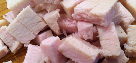 While the breads bake prepare your toppings. Leftover chicken breast, cut in cubes, is a good one (make sure you taste the meat and add some salt and pepper if it’s too bland).