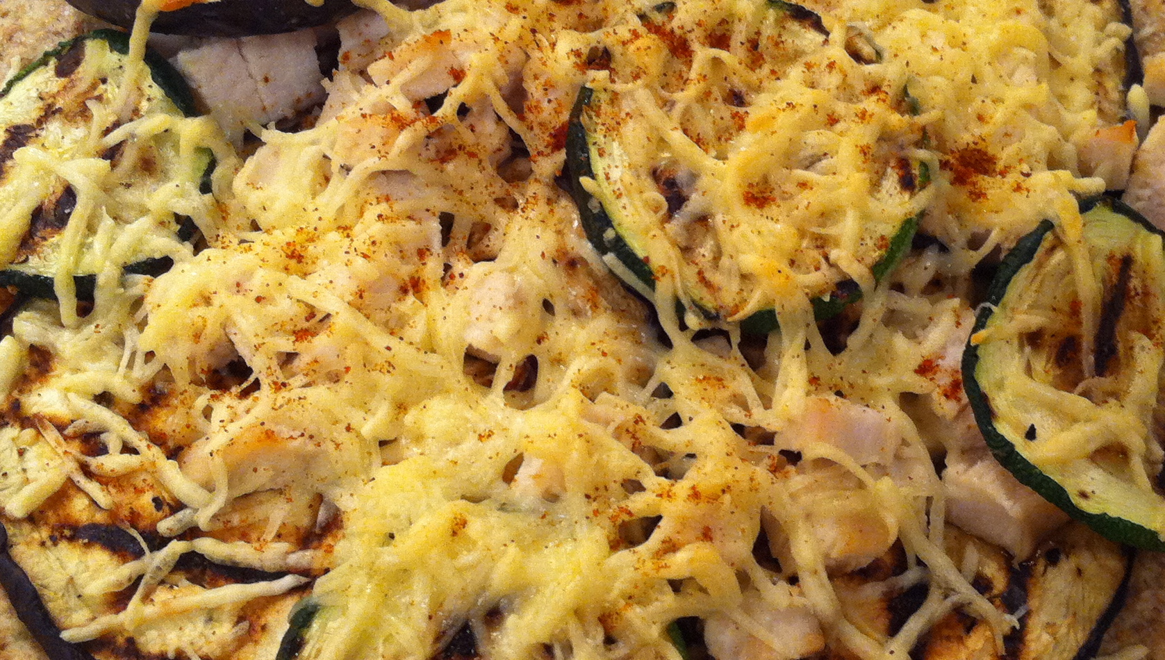 aubergine, cheese, chicken, individual, pie, pizza, whole wheat flour, zucchini
